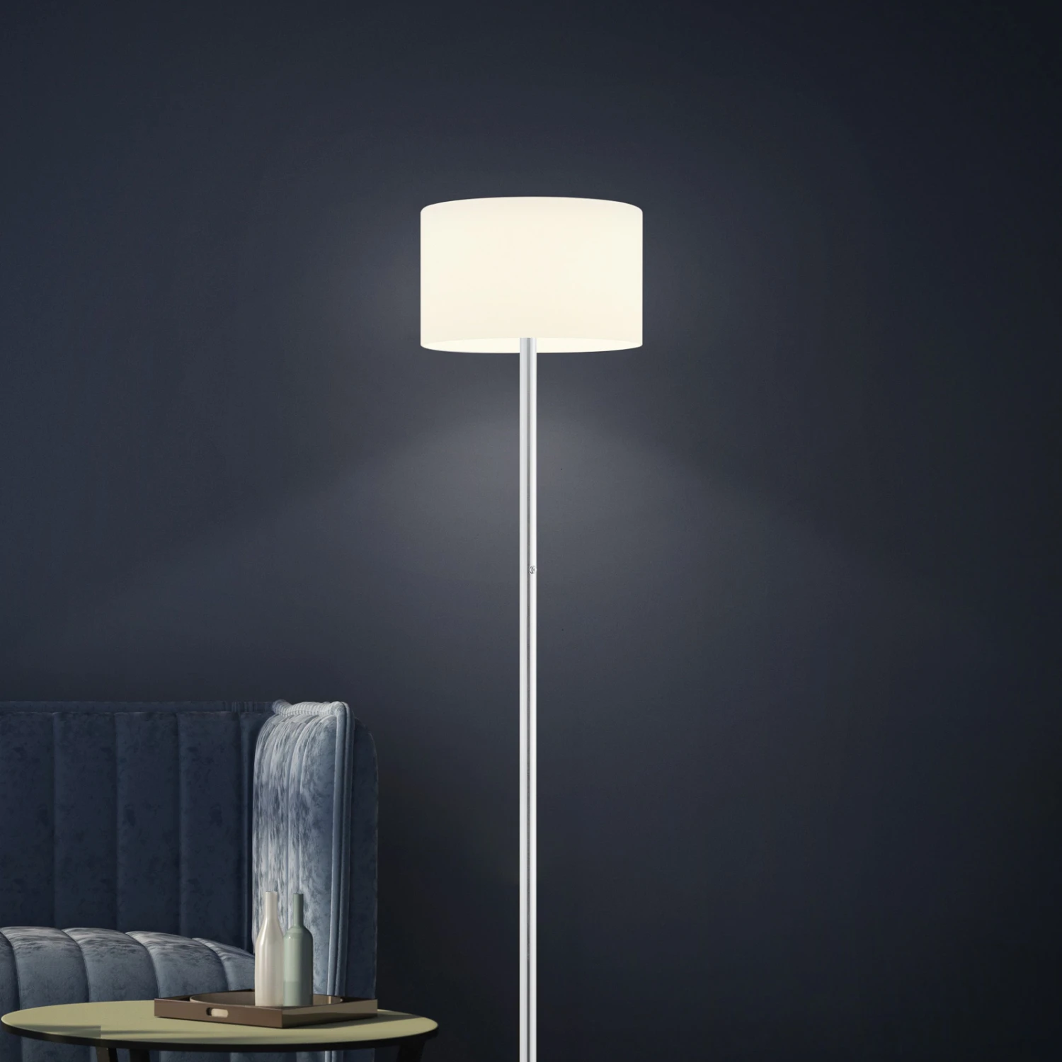 Eine zeitlose, elegante Leuchte für viele Einrichtungsstile ist die LED-Stehleuchte Grazia von BANKAMP, die aus einem runden Fuß und Gestell in schlichter Form und einem zylindrischen, oben geschlossenen Schirm aus opalweißem Glas besteht. Moderne LED-Technik sowie die Funktion „dim to warm“ machen die Stehleuchte zu einer zeitgemäßen Leuchte, die variable Beleuchtung bietet. Über den integrierten Tastdimmer kann die Helligkeit der Leuchte verändert werden. Je weiter das Licht gedimmt wird, desto wärmer und behaglicher wird die Lichtfarbe (2.700 K – 2.200 K). Hervorzuheben ist der gute Farbwiedergabeindex der Beleuchtung. Mit einem Wert von Ra >90 erzeugen die verbauten LEDs ein Licht, in dem alle Farben sehr natürlich erscheinen.