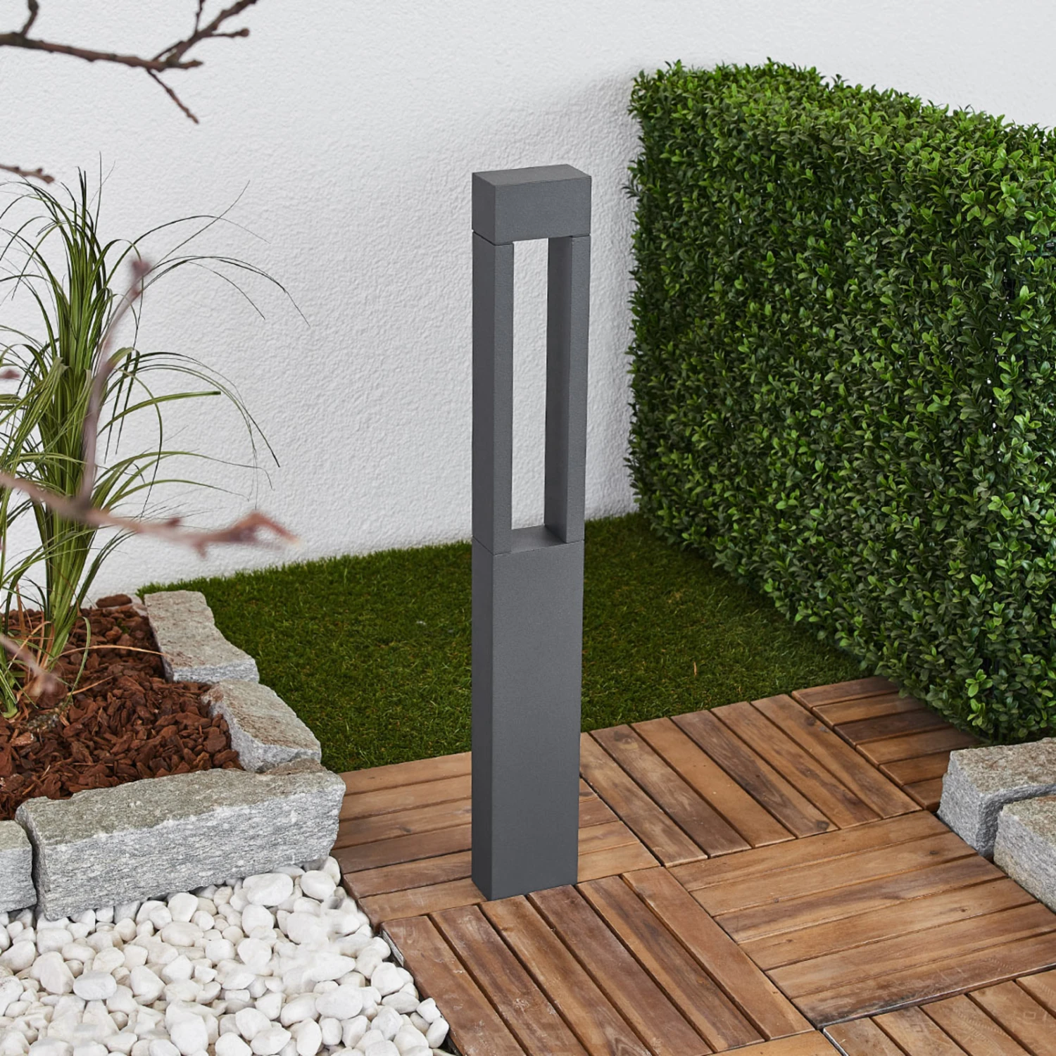 Die untere Hälfte der LED-Wegeleuchte 77265K3 besteht aus einem geschlossenen Aluminiumguss-Körper, die obere Hälfte aus einem rahmenförmigen Element, ebenfalls aus Aluminiumguss. Darin sitzt ein Diffusor aus weißem Sicherheitsglas, durch den das Licht der warmweißen LEDs im Innern eine interessante Lichtgrafik zu beiden Seiten der Leuchte entstehen lässt. An Wegen, an der Terrasse oder im Eingangsbereich bietet die LED-Wegeleuchte durch die gerichtete Lichtstrahlung tolle Effekte, besonders, wenn mehrere Leuchten montiert werden. Gegen Witterungseinflüsse ist die Leuchte dank Schutzart IP65 bestens geschützt.