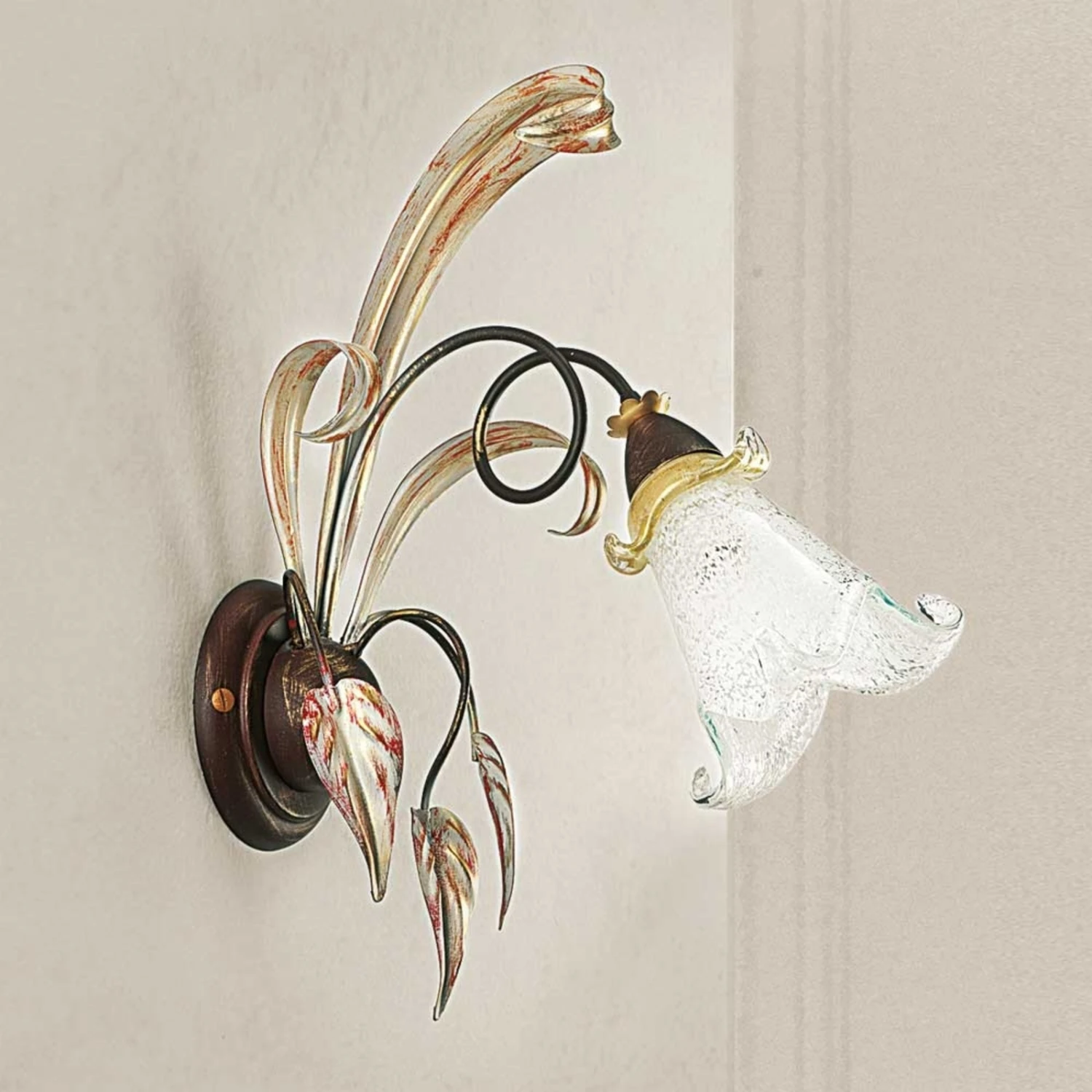Diese Leuchte zeichnet sich durch ihr florales Design aus. Der Glasleuchtschirm sieht äußerlich aus wie eine Blüte und das Gestell der Leuchte ist mit goldenen Blättern versehen. Die Leuchtarme erinnern an Äste von einem Baum, da sie filigran ineinander verschlungen sind.