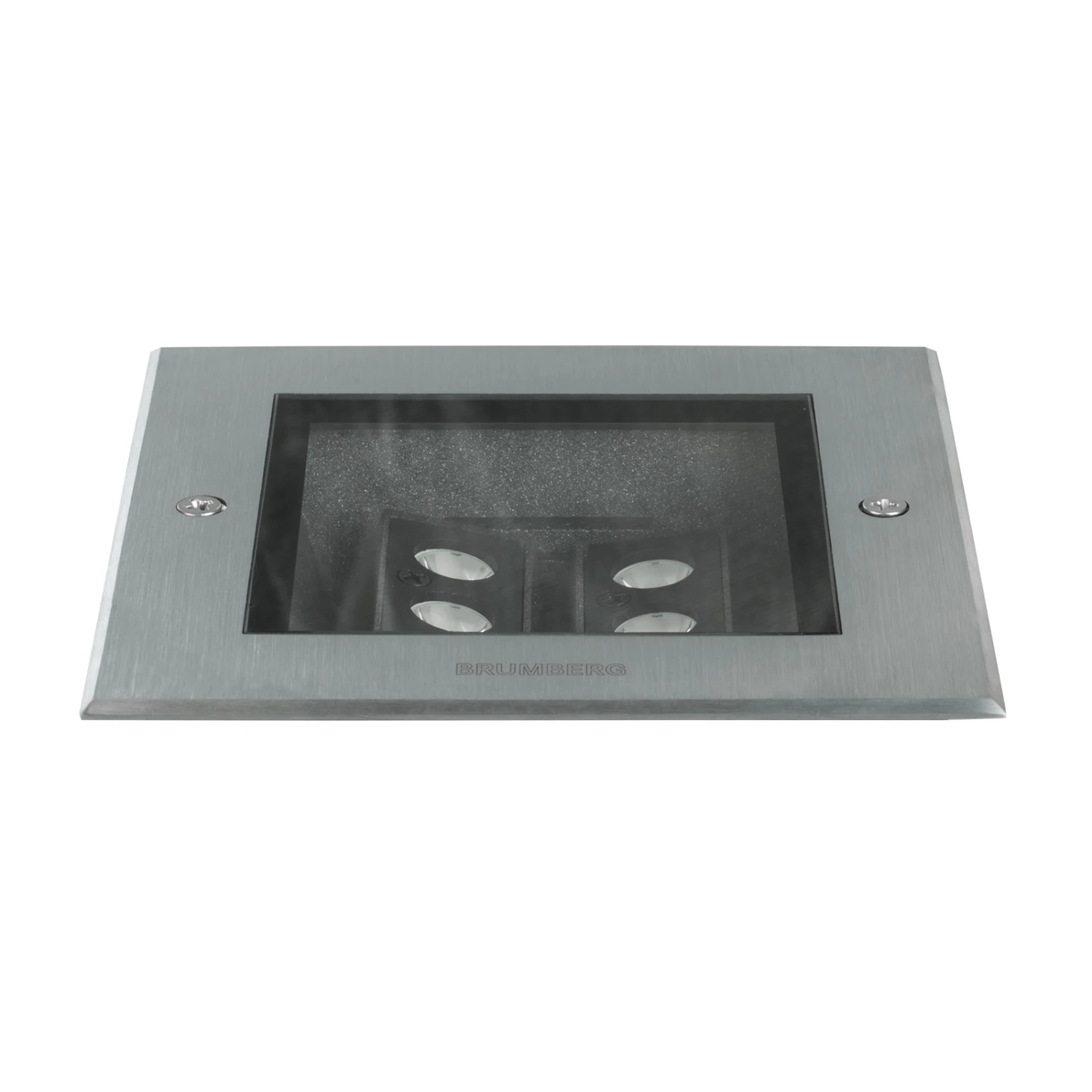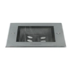 Die quadratische Boden-Einbauleuchte Hybride besteht aus einem Gehäuse aus rostfreiem V4A-Edelstahl (CrNiMo) und einer klaren Glasabdeckung. Sie ist wasserdicht, schlagfest und belastbar – ideal für den Einsatz auch in Zufahrten. Die im Inneren gelegenen LED-Module lassen sich vor der Montage schwenken, sodass beispielsweise die angrenzende Fassade betont werden kann.