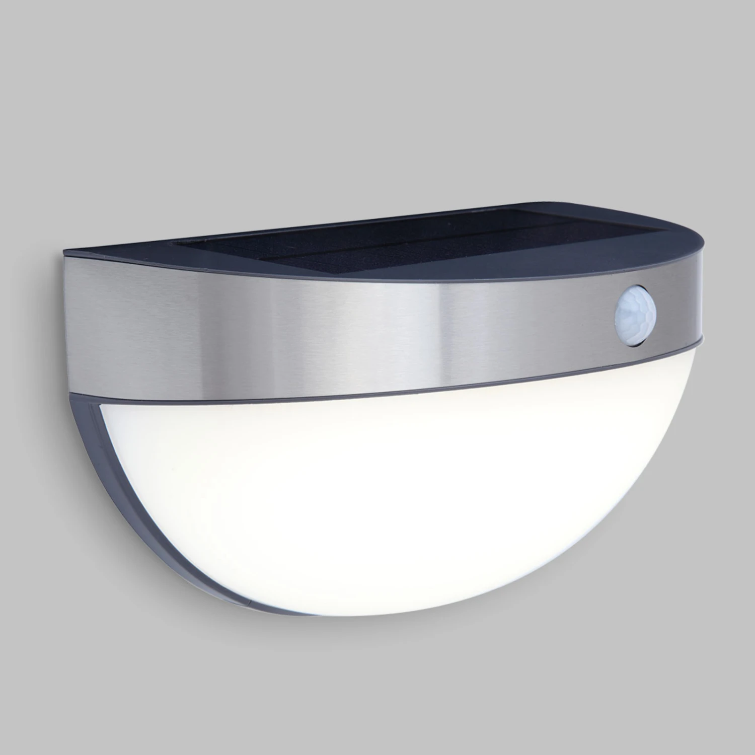 Außenbeleuchtung ganz ohne Stromanschluss lässt sich mit der LED-Solarwandleuchte Bubble realisieren, denn die Leuchte in halbrunder Gestaltung ist oben mit einem polykristallinen Solarpanel bestückt, das tagsüber den Akku lädt und die LEDs in der Dunkelheit leuchten lässt. Ein PIR-Bewegungssensor, der in den Edelstahlring integriert wurde, schaltet die Leuchte automatisch ein. Der Sensor erkennt Bewegungen aus bis zu 12 Metern Entfernung und einem Erfassungswinkel von 120°.