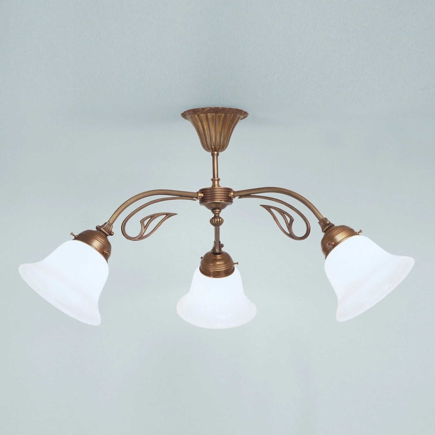 Die Deckenleuchte HERTHA überzeugt durch ein sehr reduziertes Auftreten. Die Halterung ist dabei mit hakenähnlichen Formen verziert. Darüber hinaus gibt es keine Spielerein, um nicht zu viel Aufmerksamkeit auf sich zu ziehen. Das Material der Halterung ist das qualitativ hochwertige Berliner Messing. Dieses wurde in Handarbeit zusammengesetzt und behandelt. Um die klassisch wirkende Farbe zu erzielen wurde das Messing dabei traditionell eingefärbt. Die weißen Lampenschirme sind mundgeblasen. Um Energie zu sparen lassen sich als Leuchtmittel auch LED- oder Energiesparlampen verwenden.