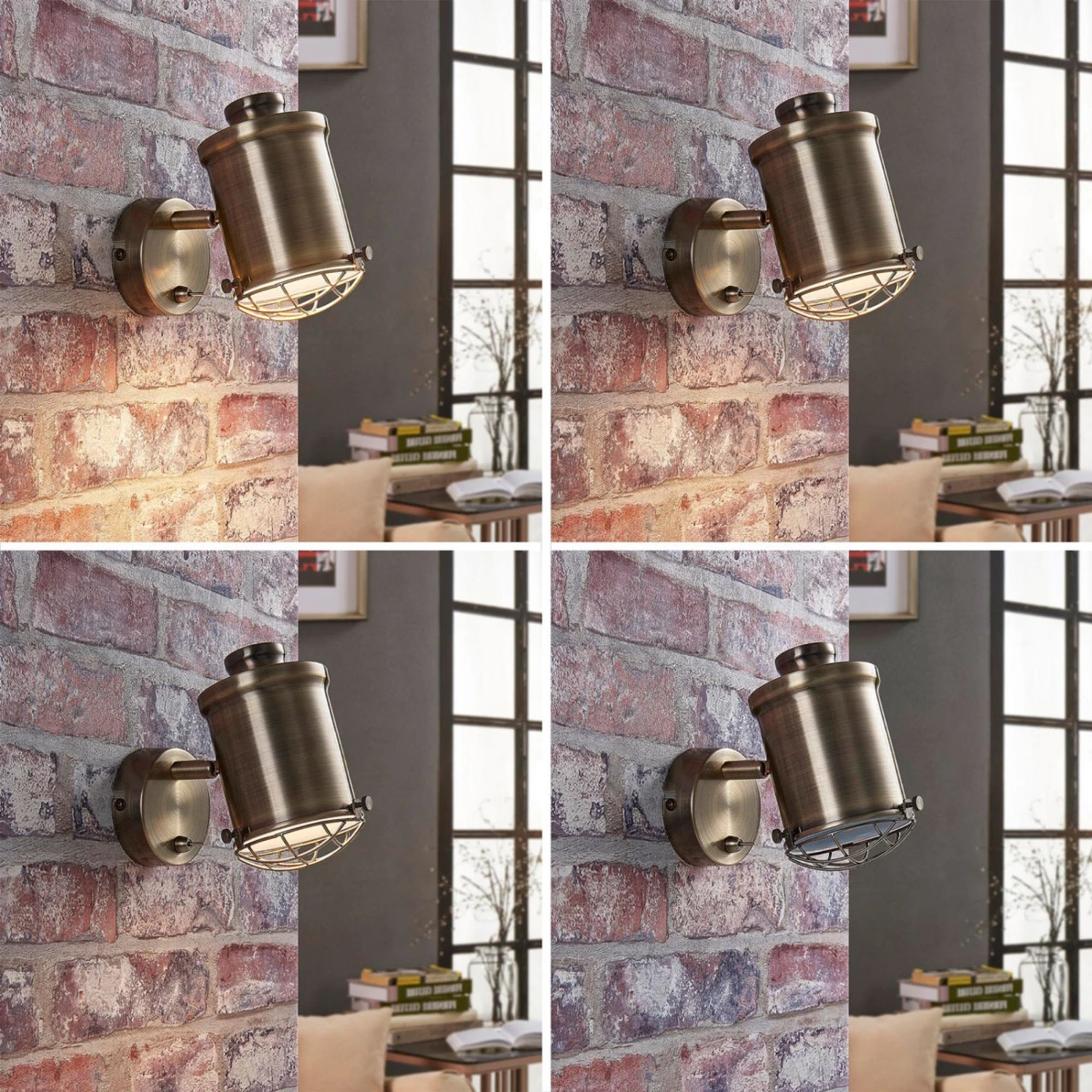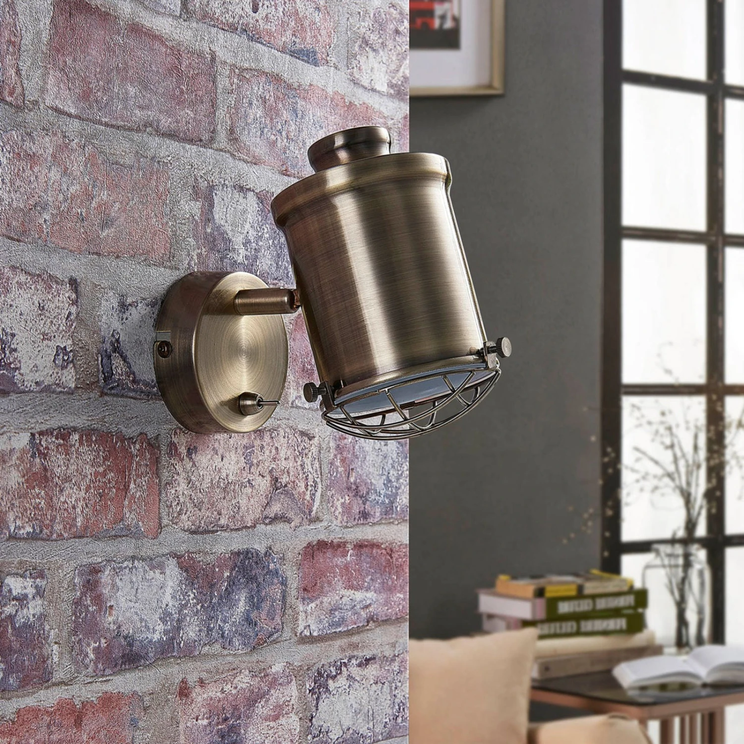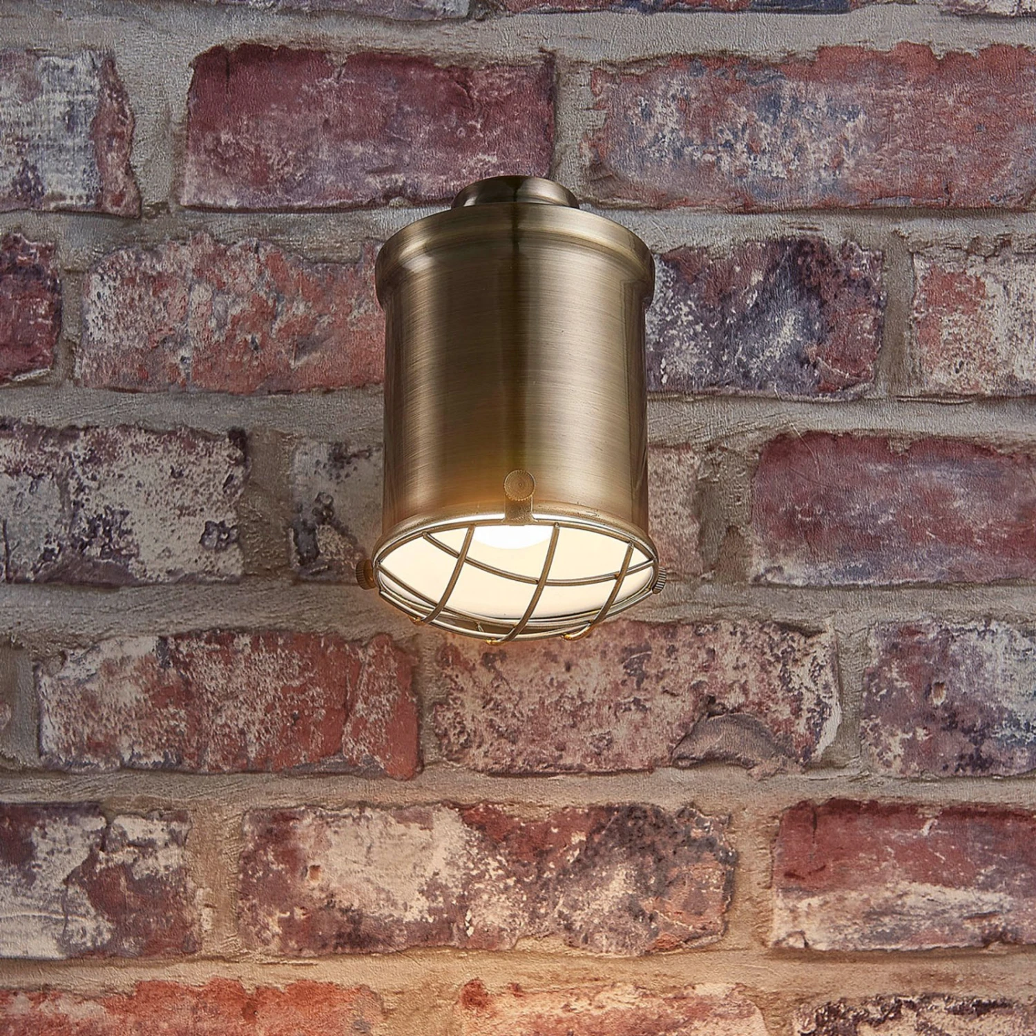 Dieser LED-Wandspot hat eine altmessingfarbene Oberfläche, die ihn mit einer antiken Wirkung versieht. Über dem Schirm sitzt eine gitterförmige Abdeckung und dahinter verbirgt sich eine E14-Fassung. An seiner Wandhalterung befindet sich ein Kippschalter, der das Ein- und Ausschalten besonders einfach macht.