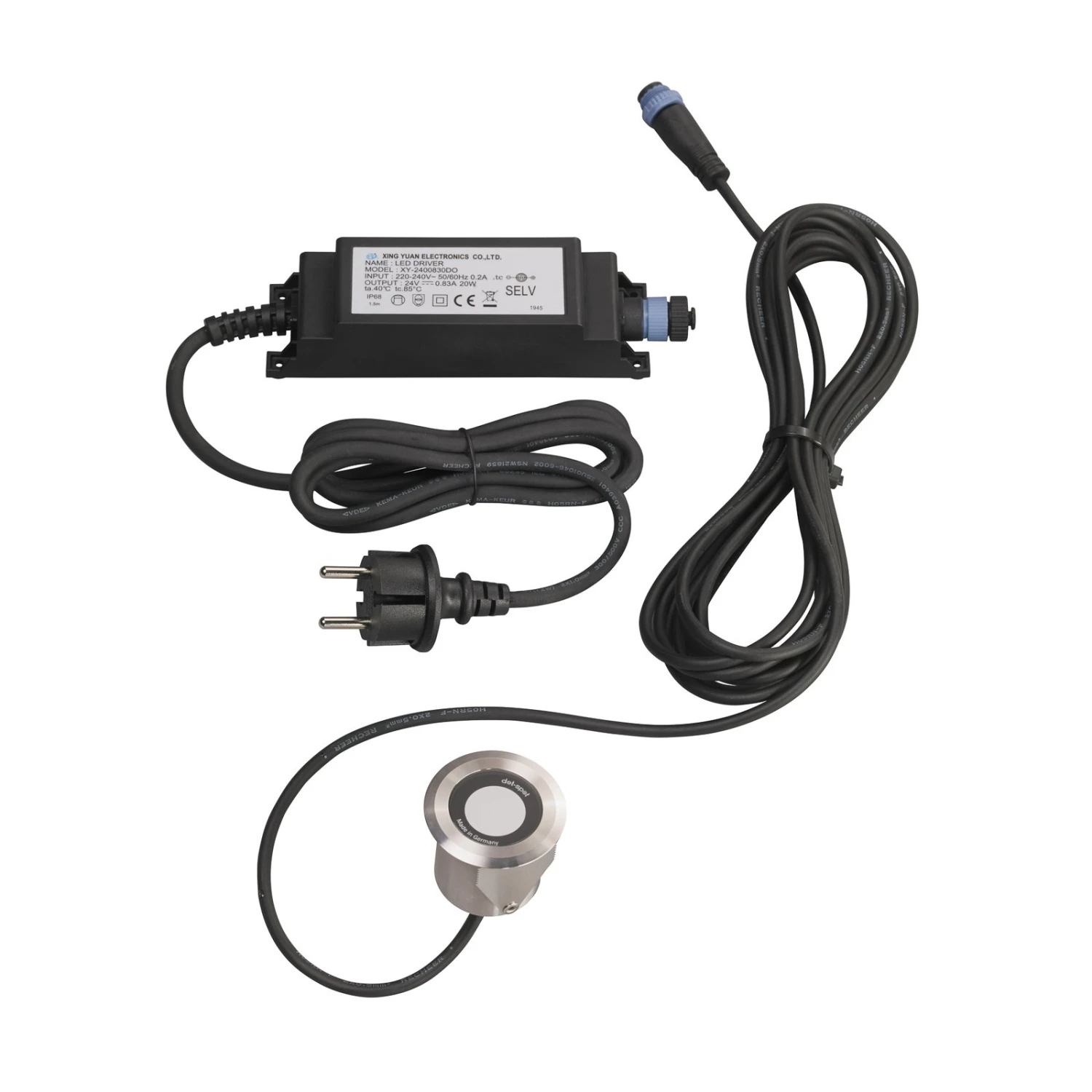 – inklusive 230 V zu 24 V Netzteil (max. 20 W) mit 1,5 m Kabel und 230 V Außenstecker