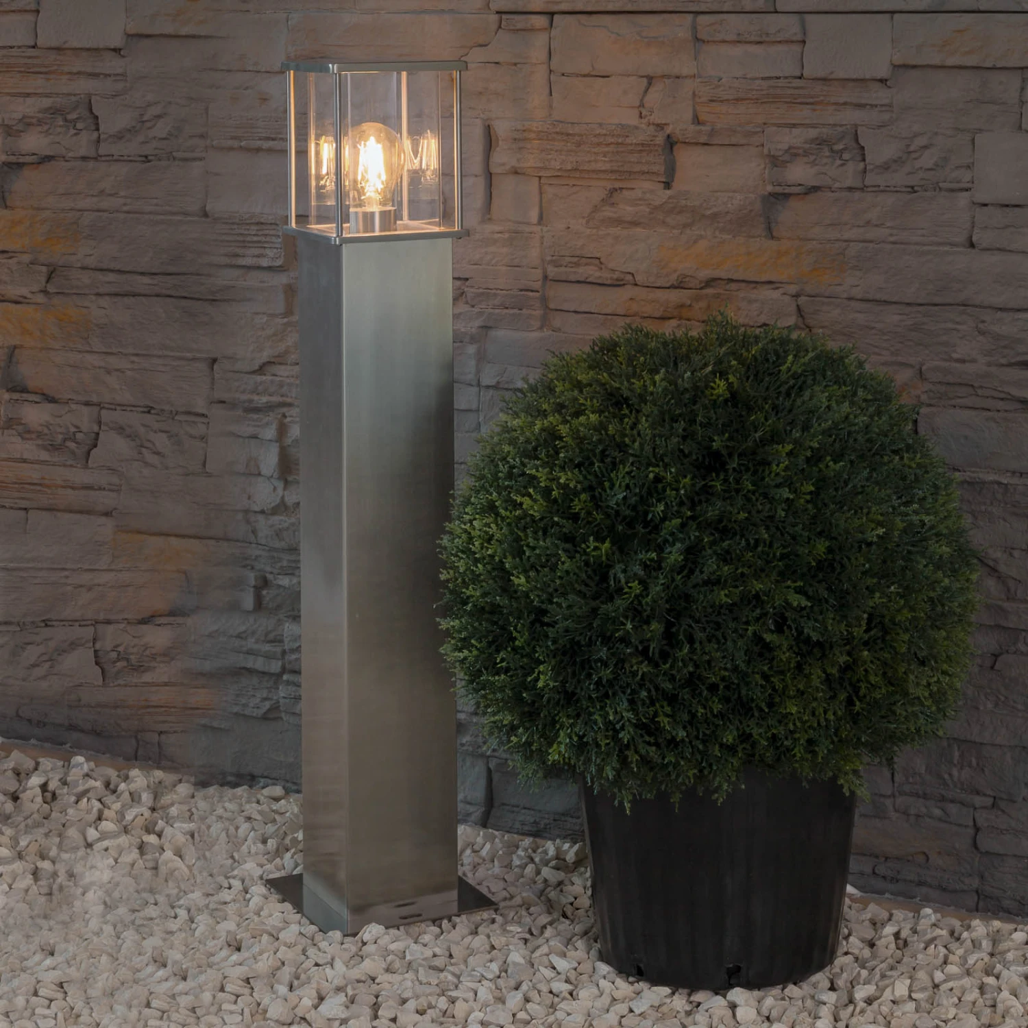 Klar strukturiert ist das Design, das die LED-Wegeleuchte Rhodos prägt. Der kantige Korpus wurde aus 1,8 mm starkem Edelstahl konzipiert, der klare Kunststoffschirm besteht aus UV-resistentem Polycarbonat und bietet freie Sicht auf die eingesetzte Lampe. Eine elegante Wegeleuchte, die dem Grundstück, auf dem sie eingesetzt wird, ebenfalls elegantes Flair verleiht.
