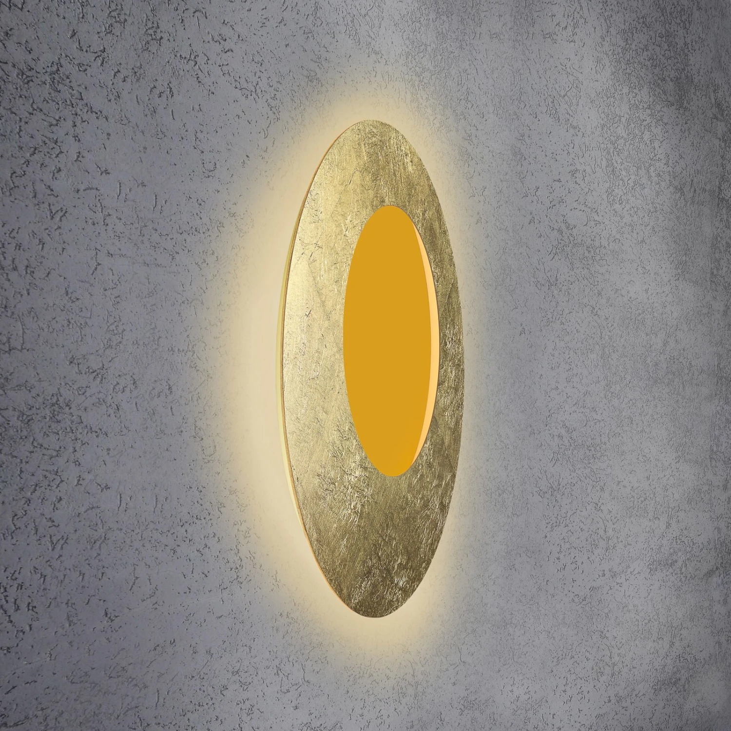 Die Wandleuchte Blade Open RGB von Escale wird in jeder modernen Einrichtung zu einem Highlight – optisch wie funktional. Sie kann dank des verbauten Casambi Bluetooth-Moduls über die passende App für Smartphone und Tablet gesteuert werden, sowohl hinsichtlich des Lichtoutputs als auch der Farbe im Bereich der RGB-LEDs. Die Leuchte überzeugt mit blendfreiem, indirektem Licht mittels rückseitig integrierter LEDs. Primär erzeugen warmweiß strahlende Dioden einen diffusen Lichthof an der Wand rings um die Leuchte. Die flache, runde Aluminium-Scheibe in hochwertigem, strukturiertem Blattgold ist leicht dezentral mit einer kreisförmigen Öffnung versehen; hier sorgen die RGB-LEDs für einen stimmungsvollen bunten Akzent.
