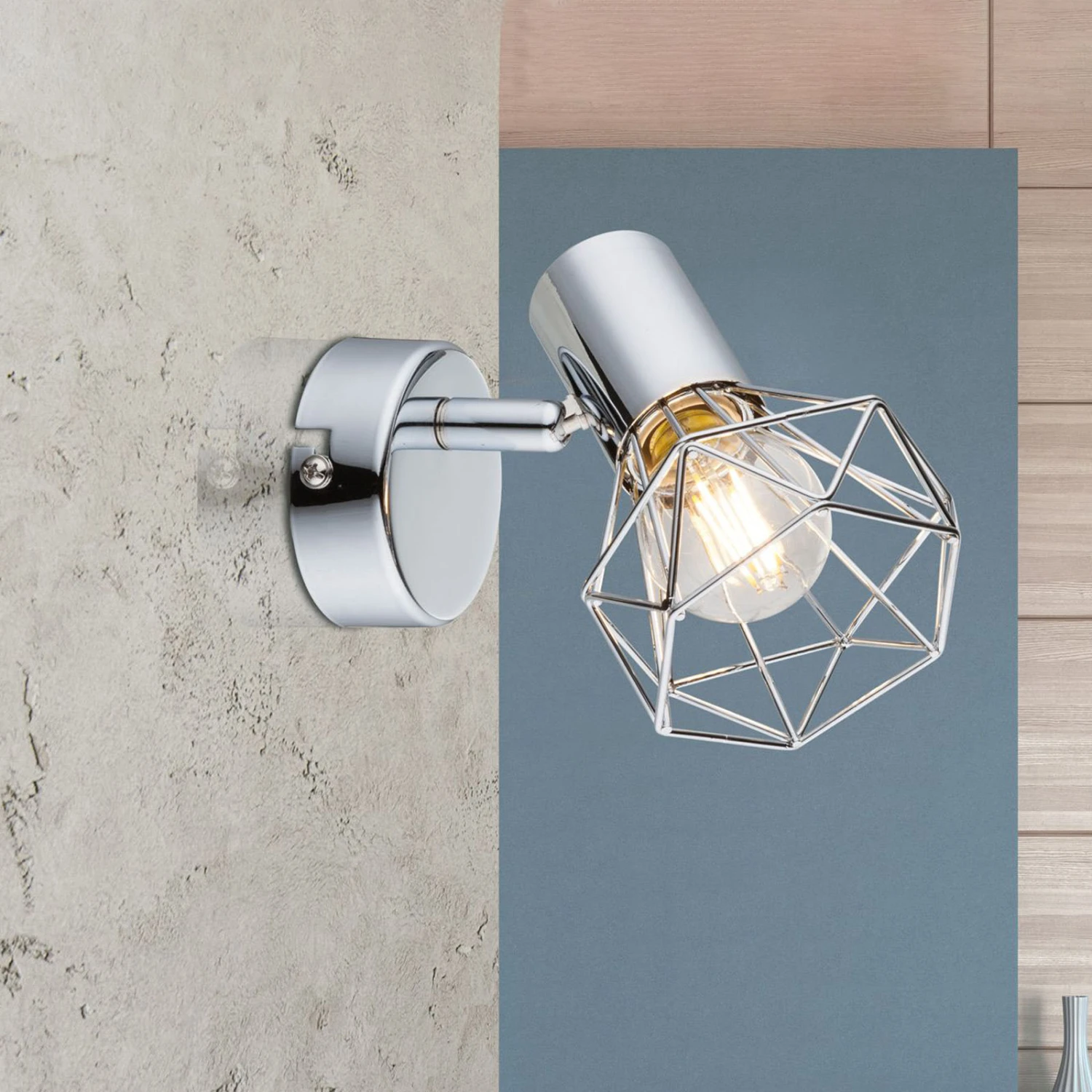 Der Wandstrahler Daiva bietet sich als sehr dekorative Variante unter den Strahlerleuchten an: Wandhalterung und Fassung präsentieren sich noch sehr dezent, der Schirm jedoch in eher ungewöhnlicher Optik: Er besteht einfach nur aus einem verchromten Metallkäfig, der den Blick auf das Leuchtmittel frei lässt. In die Fassung kann ein E14-Leuchtmittel mit max. 40 W eingesetzt werden. Da das Leuchtmittel zu sehen ist, bietet sich die Verwendung einer besonders dekorativen Lampe, wie z. B. eine Retrofit-Glühlampe, an. Passende Leuchtmittel sind unter Zubehör erhältlich.