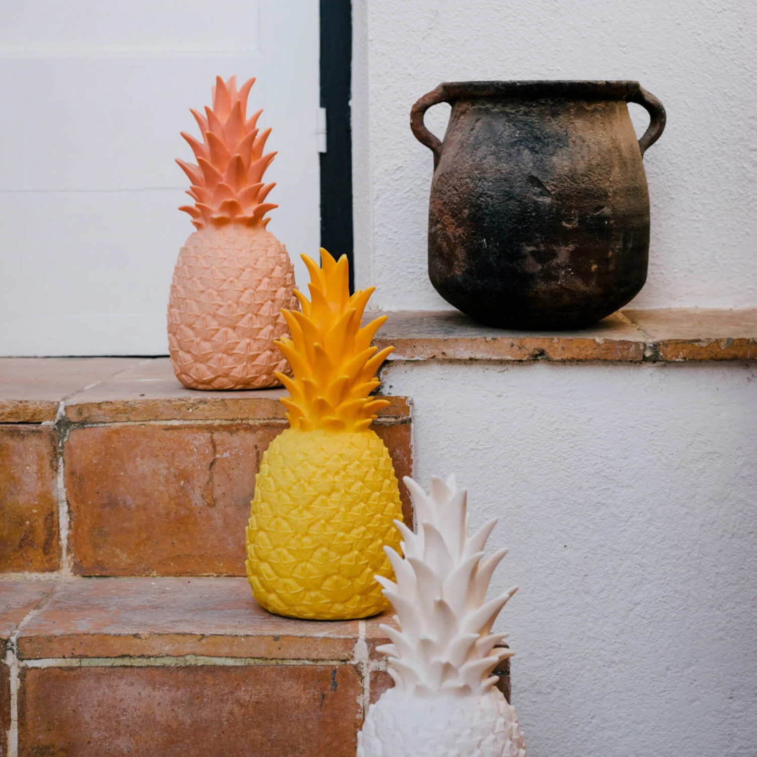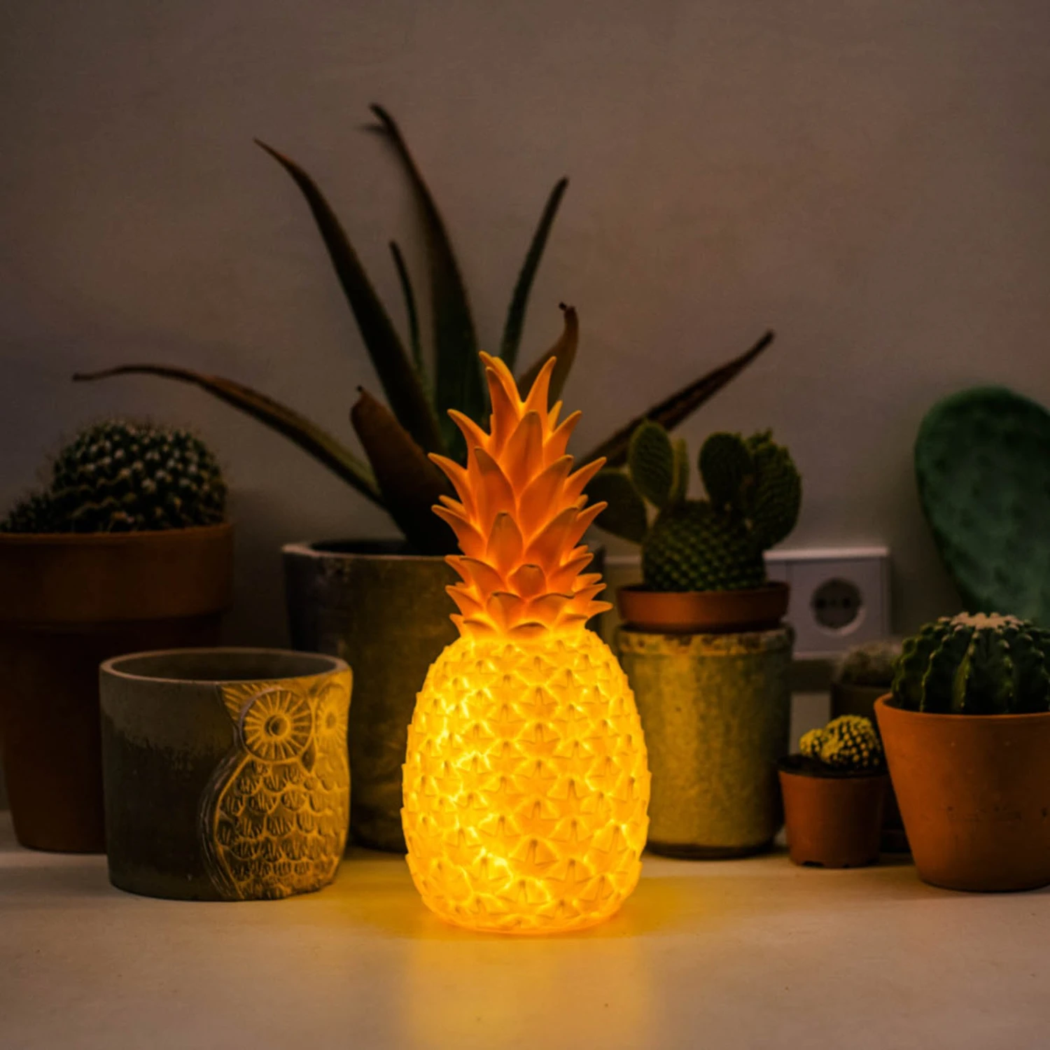 Pinacolada besitzt ein realistisches Design, das an eine echte Ananas erinnert. Sie ist aus Vinyl gefertigt und ist stoßfest und witterungsbeständig. Die Schutzart IP54 schützt sie gegen Staub und Spritzwasser, sodass sie perfekt für eine Terrasse geeignet ist. Ihre LEDs können mit Hilfe einer Fernbedienung ihre Lichtfarbe ändern und somit in warmweißem und buntem Licht leuchten (RGBW). Darüber hinaus ist die LED-Dekoleuchte in drei Helligkeitsstufen einstellbar und besitzt einen Kerzenscheinmodus. Die Leuchte wird durch die mitgelieferte Induktionsladestation aufgeladen.