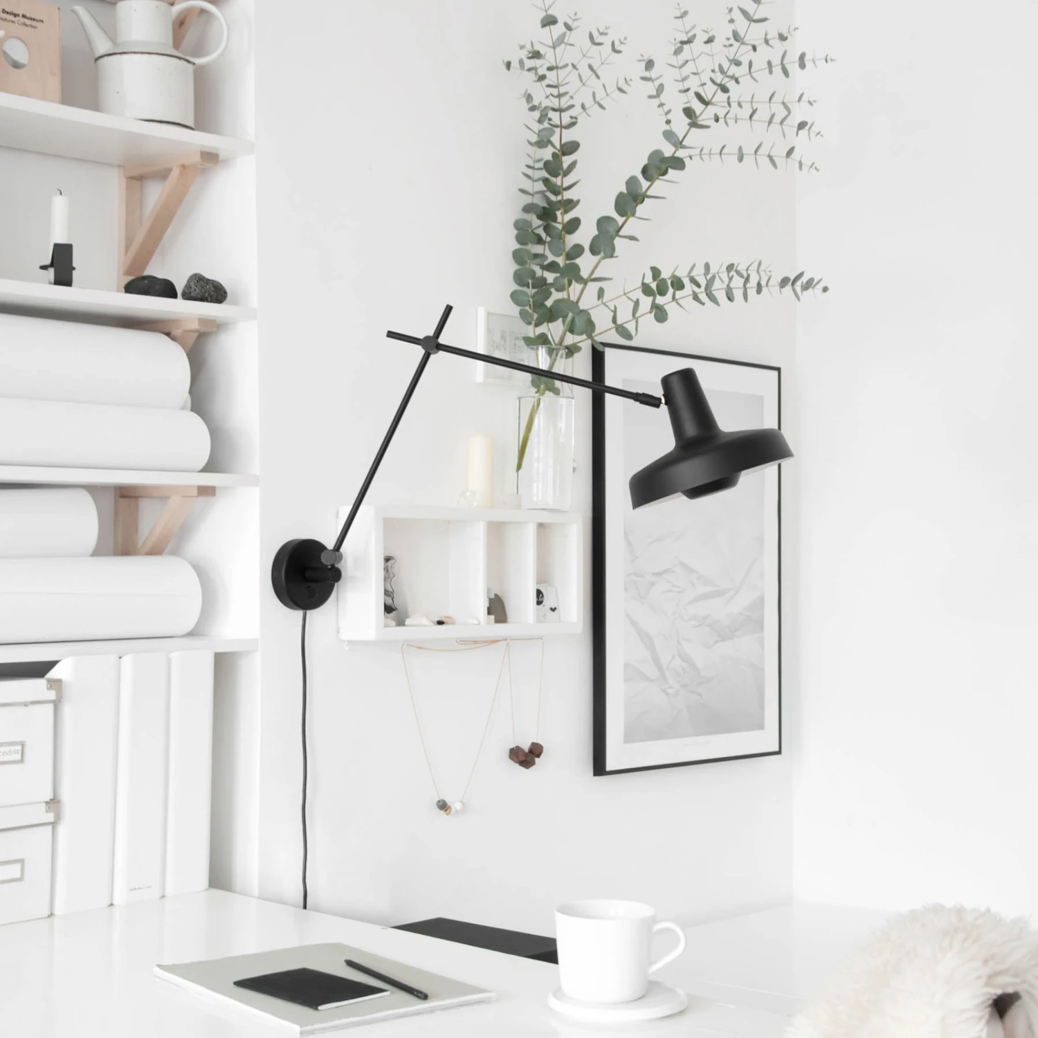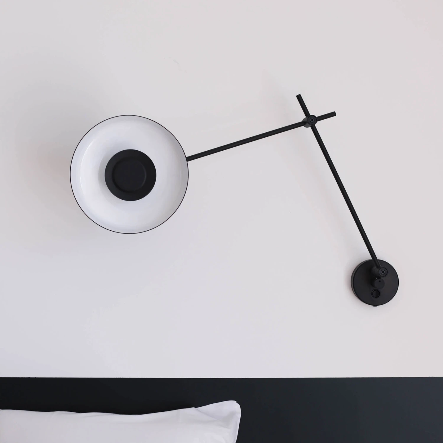 Die vom kroatischen Unternehmen GRUPA entworfene und produzierte Wandleuchte Arigato ist ein Meister der Vielseitigkeit hinsichtlich Kombinierbarkeit und Justierbarkeit. An der runden Wandhalterung ist ein in zwei Abschnitte gegliederter Arm aus Stahl angebracht, der einen runden Schirm aus Aluminium hält. Alle Abschnitte sind mit Gelenken verbunden, sodass die Orientierung und Position des Schirms frei angepasst werden kann. Das Leuchtmittel wird hinter einer Blende eingesetzt, was den Sehkomfort steigert. Die weiß lackierte Innenseite des Schirms gewährleistet eine effiziente Lichtabstrahlung.