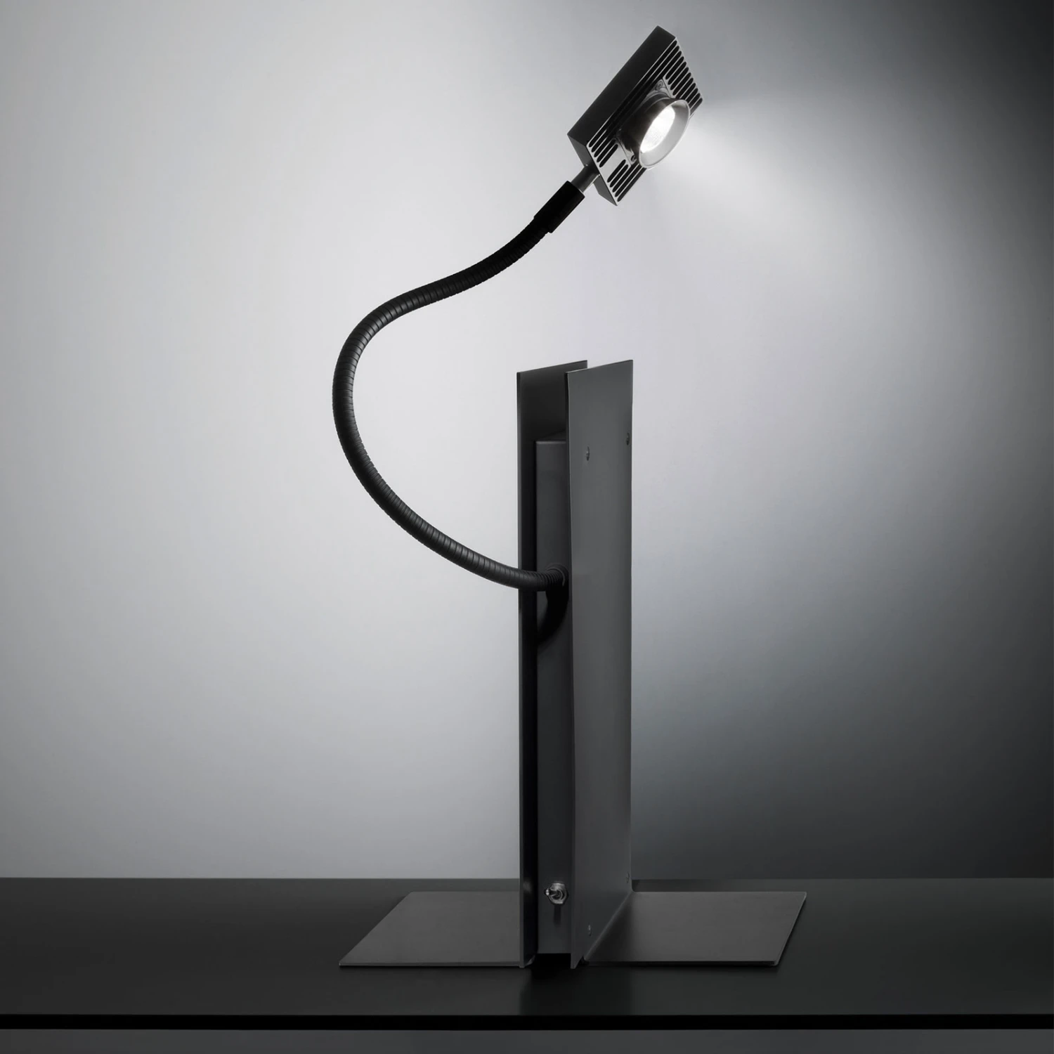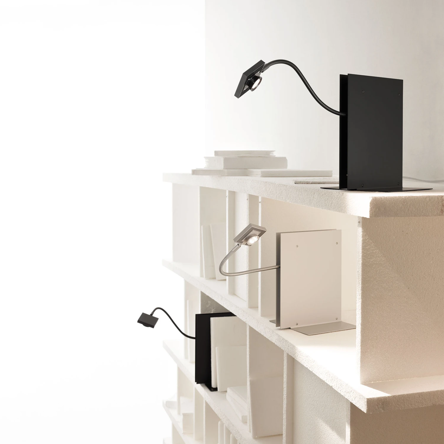 Der Körper aus Aluminium bietet nach links und rechts Abstellfläche für Bücher oder auch Accessoires. In der Mitte ist eine Buchstütze montiert, an der ein Kippschalter und das 400 cm lange Kabel montiert sind. Durch die Länge des Kabels lässt sich dieses problemlos und unauffällig auch hinter Regalen entlang legen und zur nächsten Steckdose führen. Die warmweiß leuchtende LED-Lichtquelle ist an einem flexiblen Schwanenhals montiert. Durch diesen beweglichen Metallarm ist die Ausrichtung des Lichtstrahls variabel möglich und kann immer passend eingestellt werden. So können auch in eher dunkleren Nischen und Ecken effektvolle Akzente gesetzt werden und Objekte gekonnt in Szene gesetzt werden.