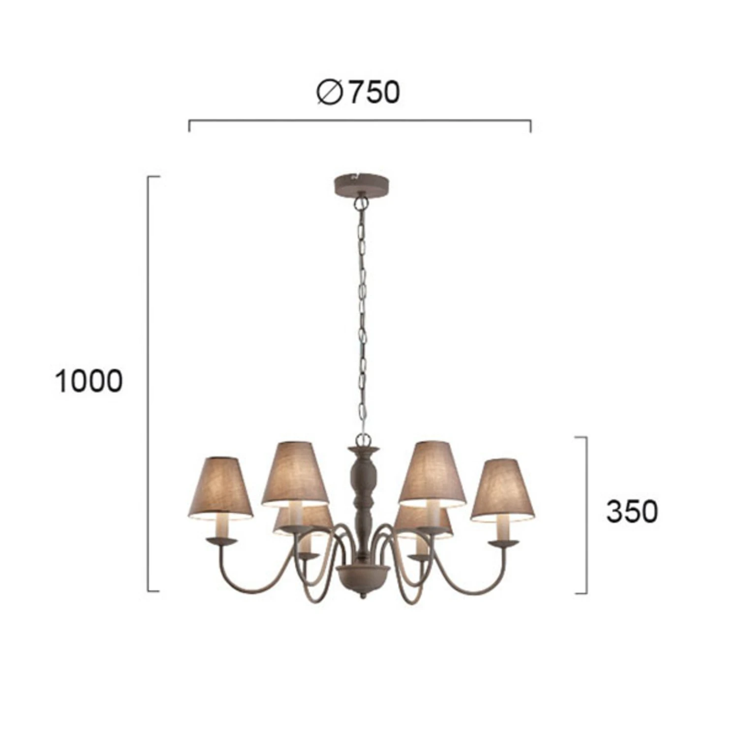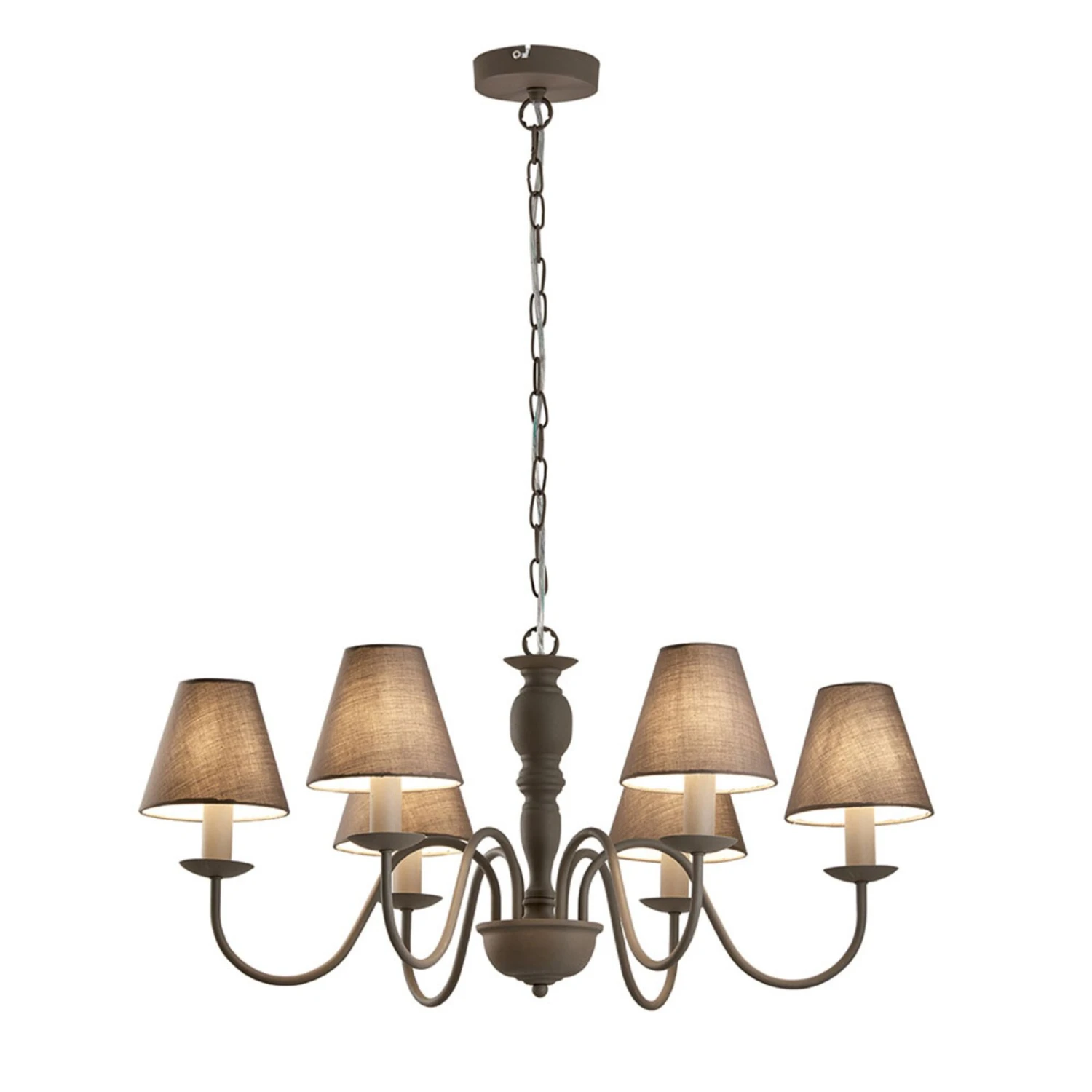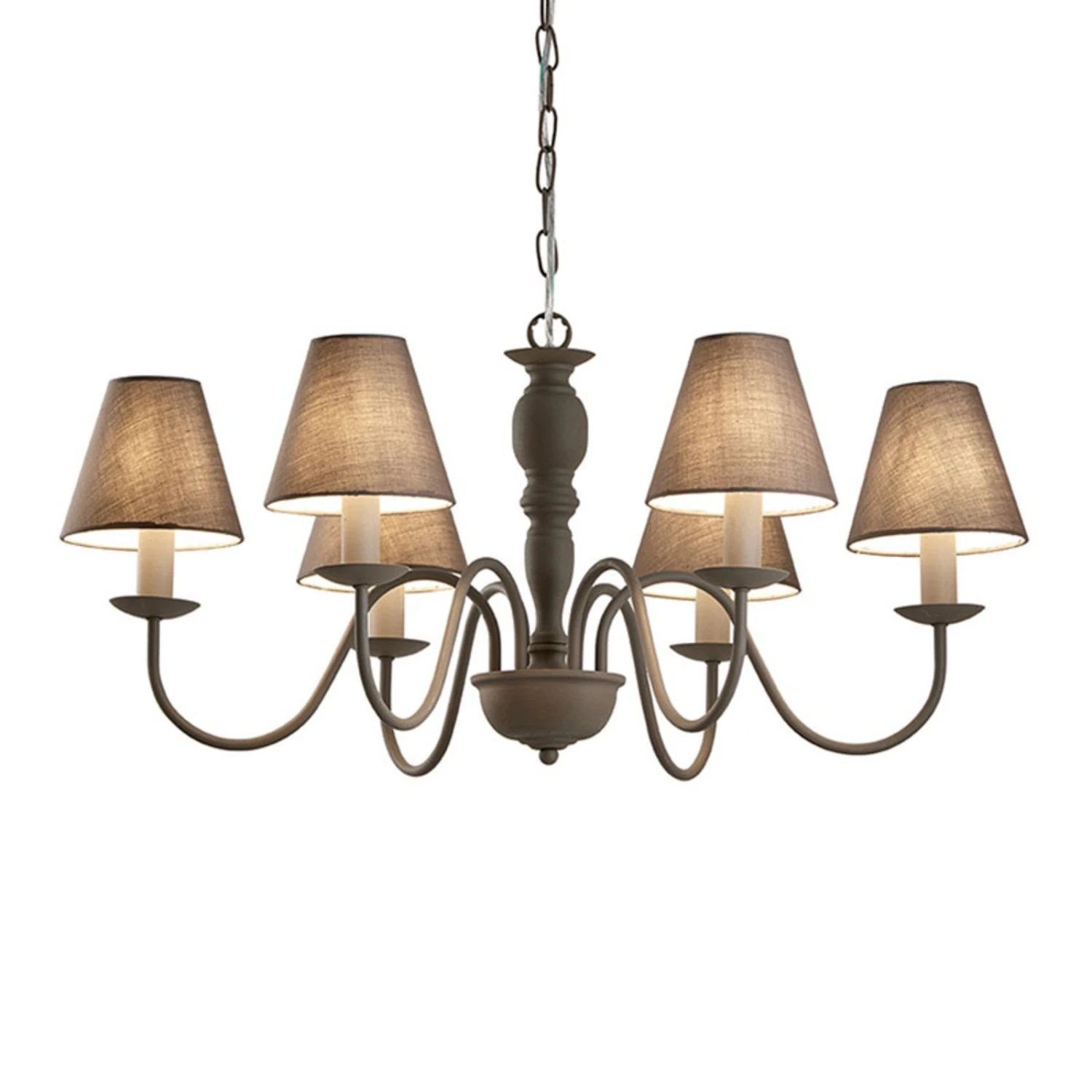 Sechsflammiger, formschöner Kronleuchter Fatima mit Stoffschirmen Der sechsflammige Kronleuchter Fatima mit seinem rustikalen Design fällt sofort ins Auge. Der Kronleuchter besteht aus sechs Armen und in grau gehaltenen, aus Stoff bestehenden Lampenschirmen. Das stilvoll geschwungene Gestell lässt sich gut in einem Landhausstil kombinieren und dient als ein elegantes Dekoelement. Die sechs Leuchtmittel mit E14-Fassung (nicht erhalten) sorgen für eine sehr gute Raumbeleuchtung.