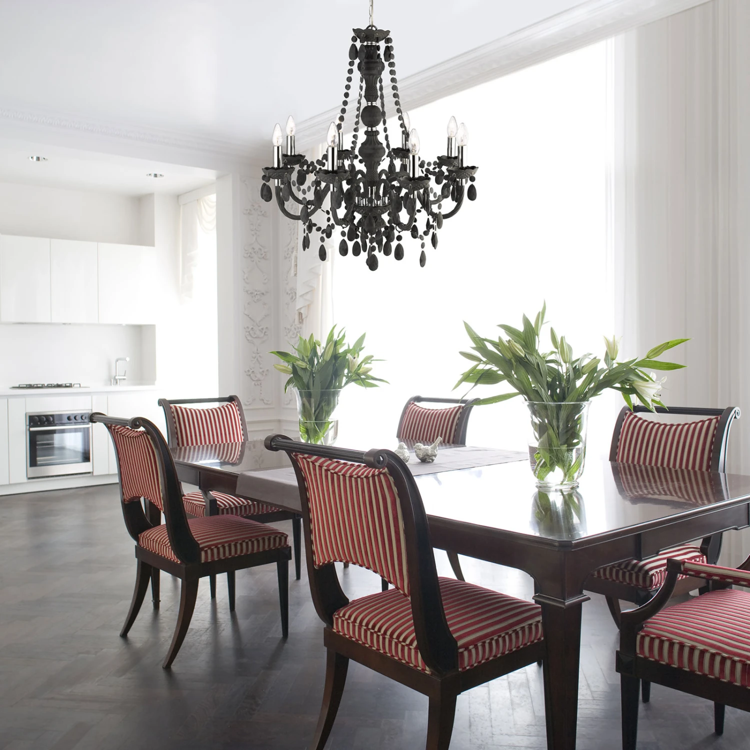 In der für einen Kronleuchter ungewöhnlichen Farbe Dunkelgrau mit matter Oberfläche präsentiert sich der sehr klassisch gestaltete Kronleuchter. Diese Gegensätze machen aus dem Kronleuchter Marie Therese eine auffällige Erscheinung, die zum Mittelpunkt des Raumes wird. Über einem Tisch angebracht, spendet er durch die frei in den Kerzenschäften sitzenden Leuchtmittel (nicht enthalten) eine schöne Allgemeinbeleuchtung, die auch für größere Räume ausreicht. Ebenso prachtvoll wirkt der Kronleuchter Marie Therese in einem großen Flur bzw. einer Eingangshalle. Der zahlreiche Behang in Form von Tropfen, flachen und runden Elementen aus Acryl, die teilweise zu Ketten aufgereiht wurden, ziert den achtarmigen Kronleuchter zusätzlich.