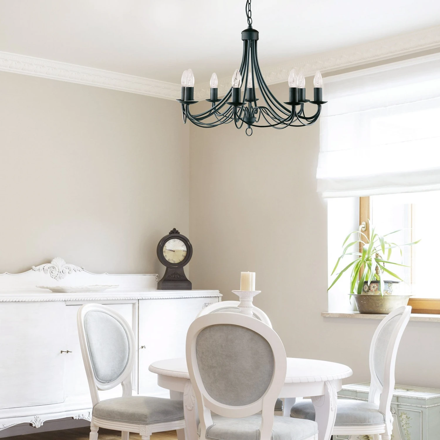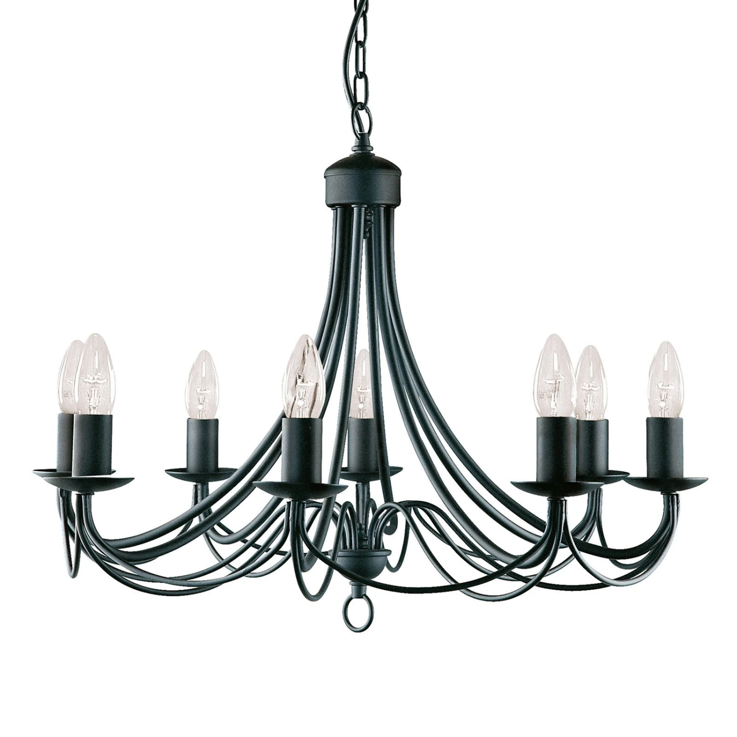 Der in mattem Schwarz lackierte Kronleuchter Maypole ist ein Klassiker, der sich für die vielfältigsten Beleuchtungsaufgaben eignet. Ohne Verzierungen und doch schön geschwungen gestaltet, besticht er durch eine moderne Schlichtheit, wobei er durch seine matt-schwarze Farbgebung ins Auge fällt. Der Kronleuchter kann zur Tischbeleuchtung im Esszimmer ebenso eingesetzt werden wie zur allgemeinen Beleuchtung eines Raumes und lässt sich in viele Wohnstile integrieren. Auch im Bereich der Gastronomie ist er eine sehr gute Wahl.