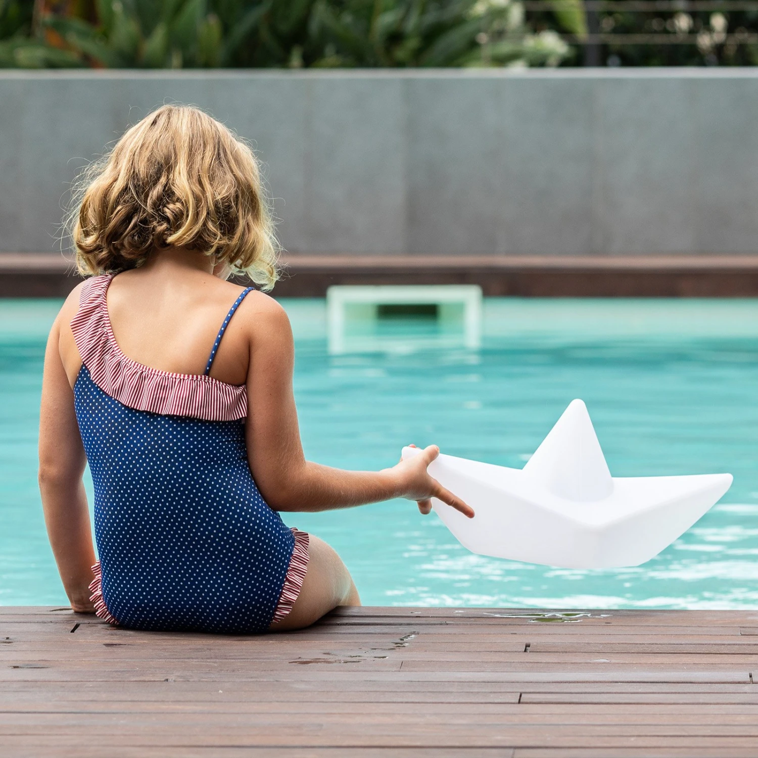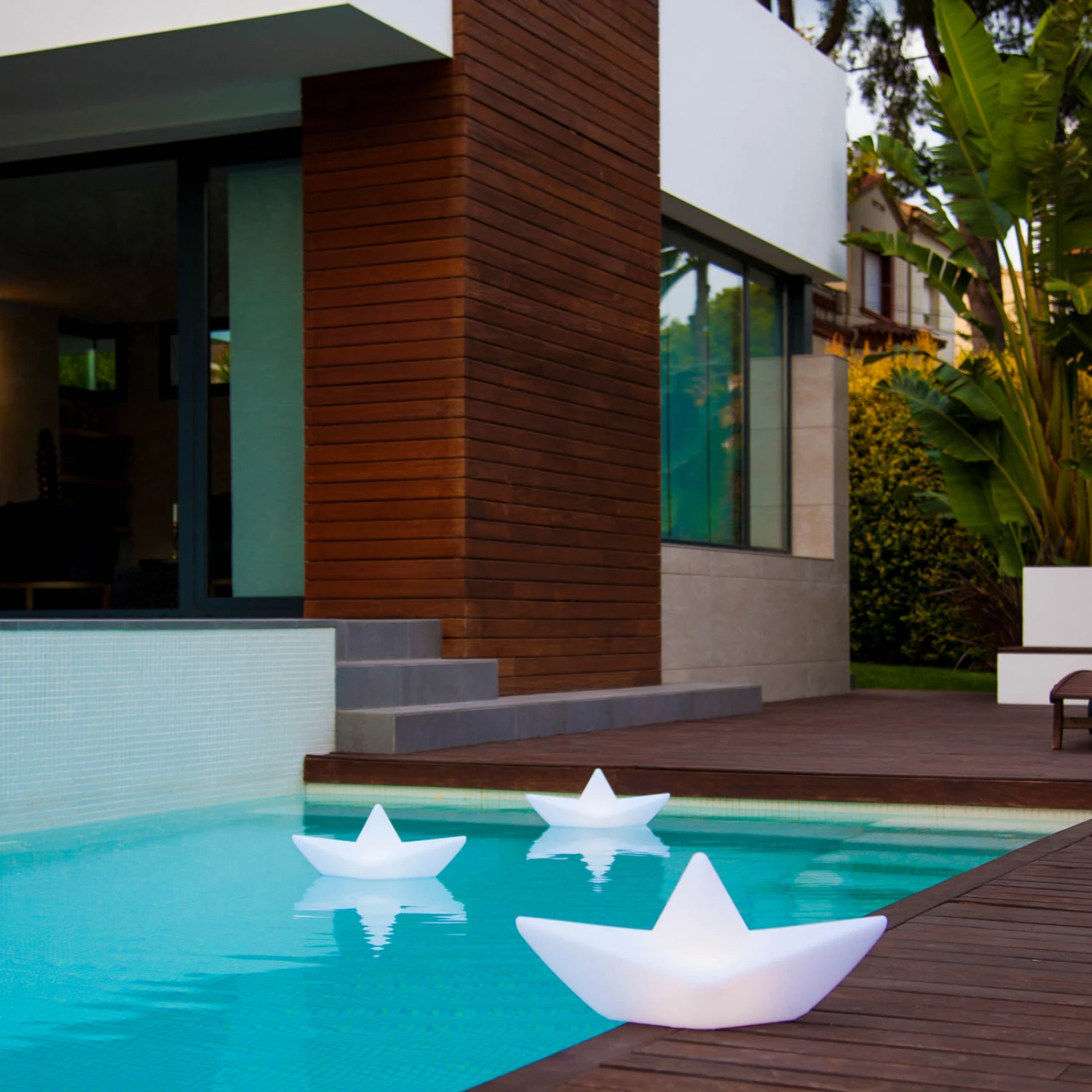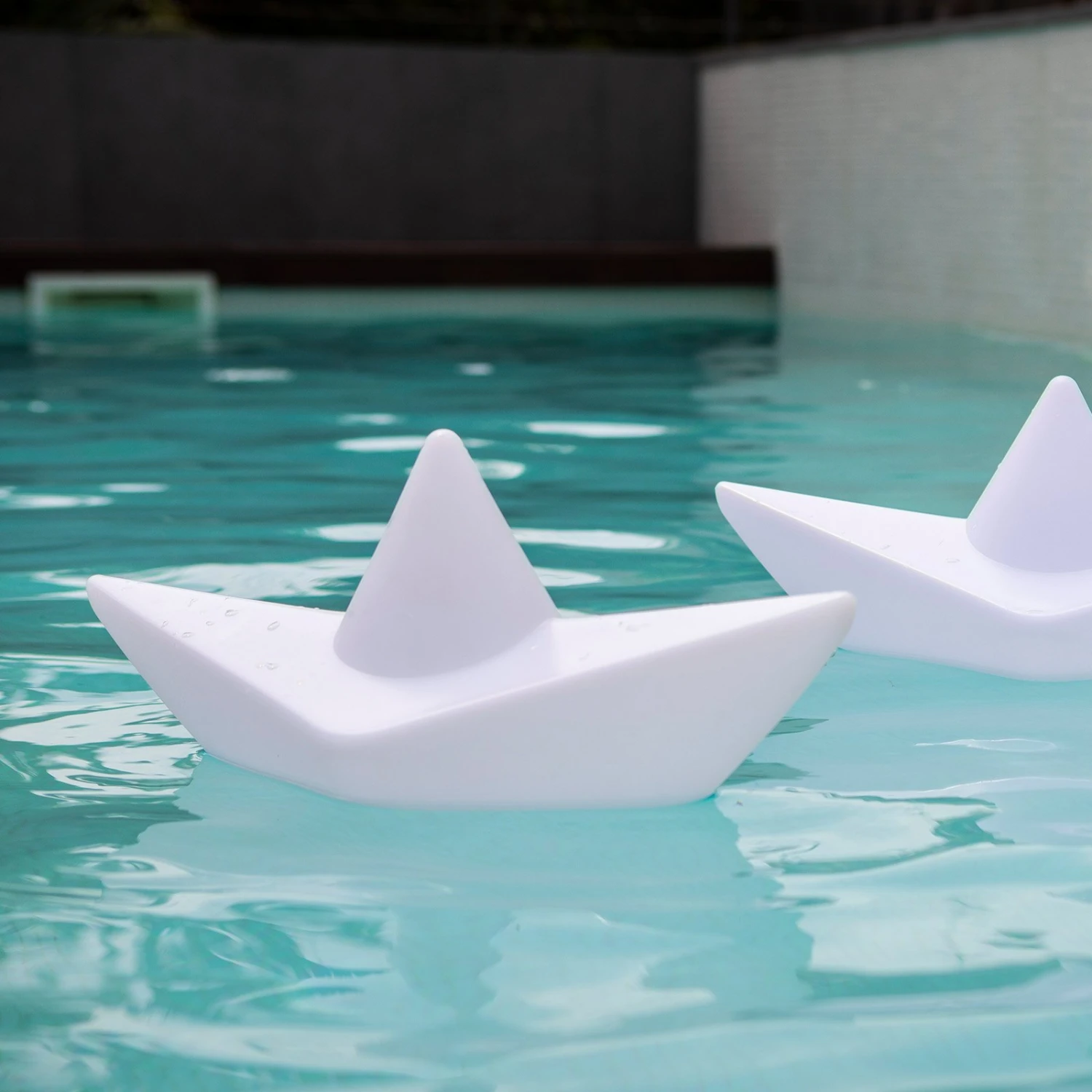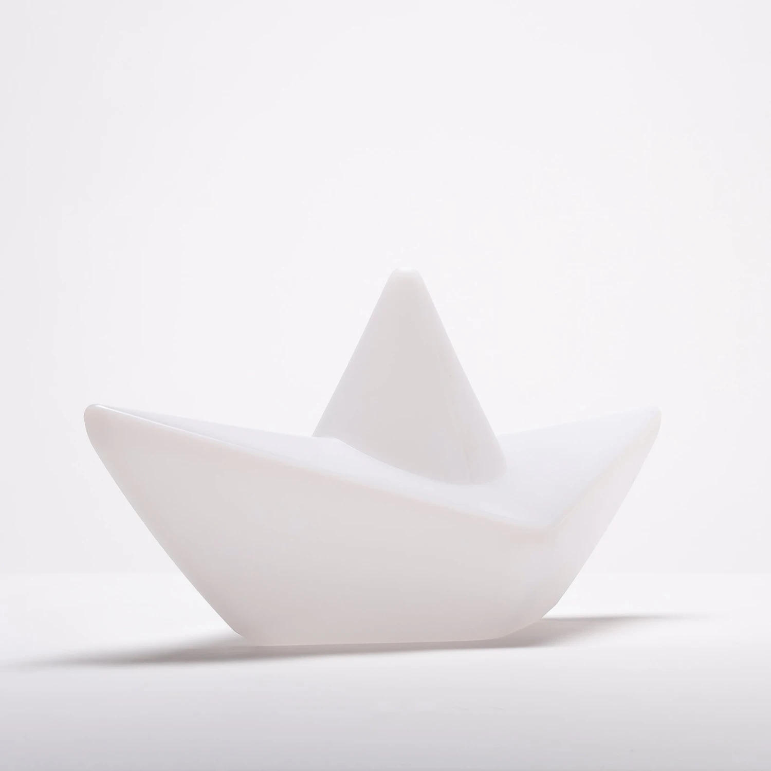 The BOAT Lamp™ ist eine Dekoleuchte aus hochwertigem, bruchfestem Kunststoff, die in ihrer Form an Papierschiffchen im Origami-Stil erinnert. Sie ist wasserdicht und schwimmfähig, wodurch sich die Leuchte vor allem zur stimmungsvollen Illumination von Teichen und Pools im Außenbereich eignet – dank der Korrosionsbeständigkeit auch bei Salzwasser. Sie ist dabei absolut flexibel, da sie mit ihrer kabellosen Akku-LED Technik von der mitgelieferten Induktionsladestation zu jedem gewünschten Platz transportiert werden kann. Das Laden erfolgt über ein USB-Kabel.