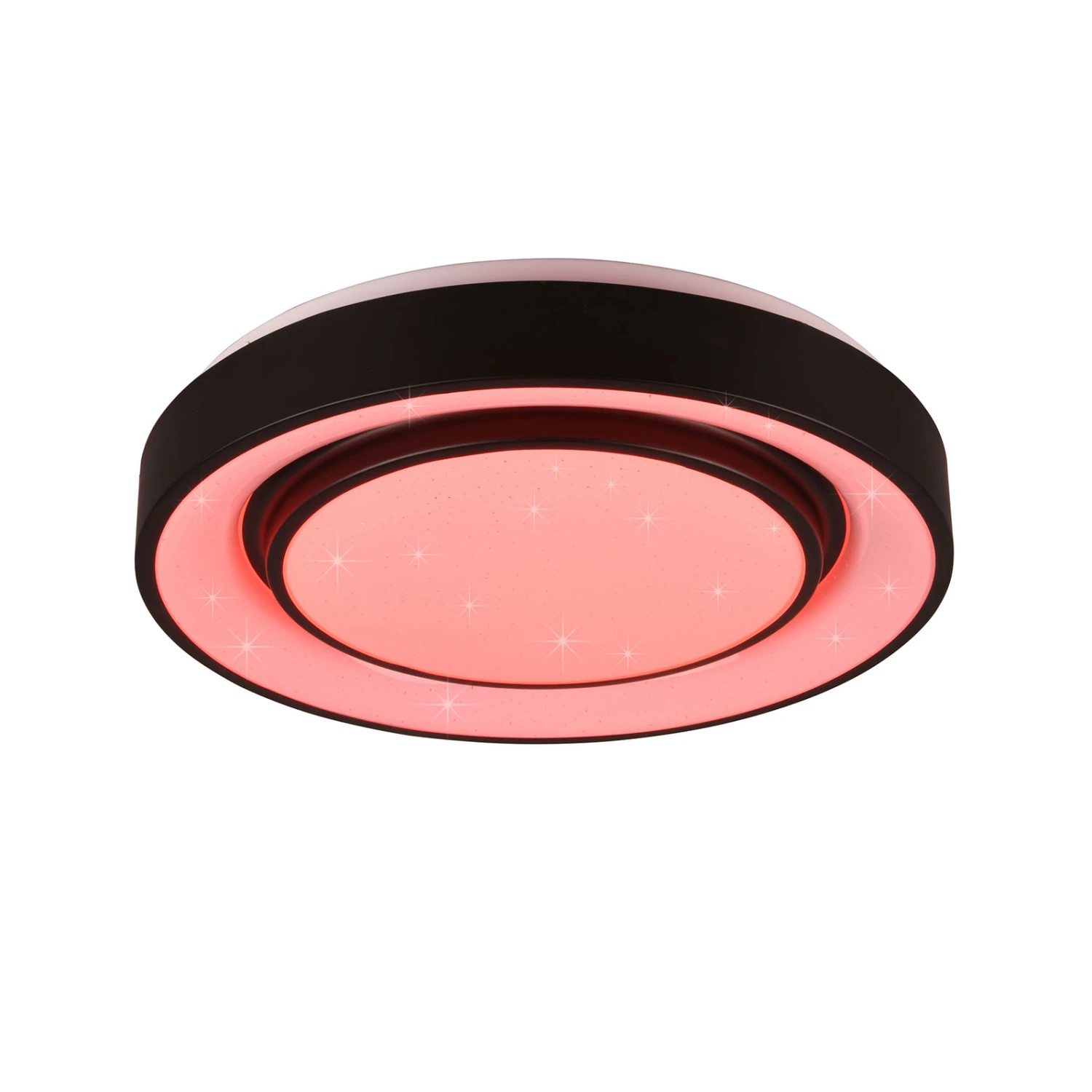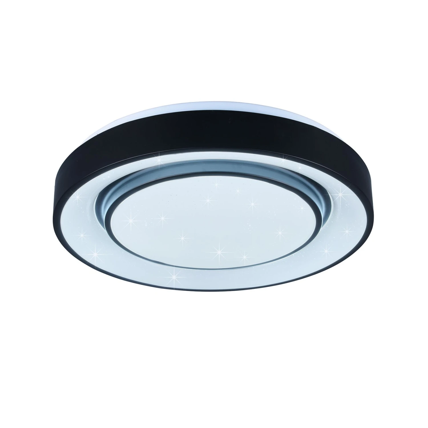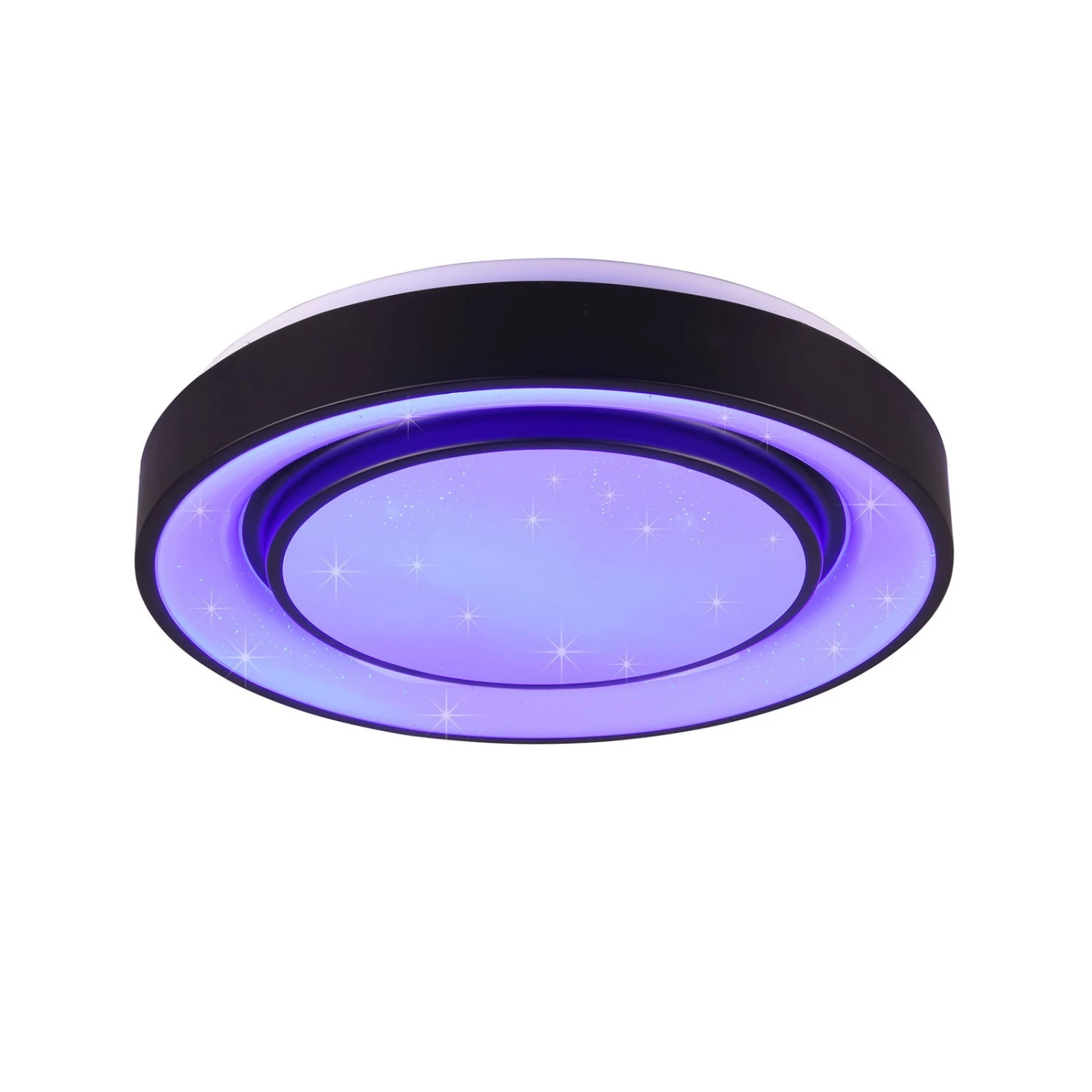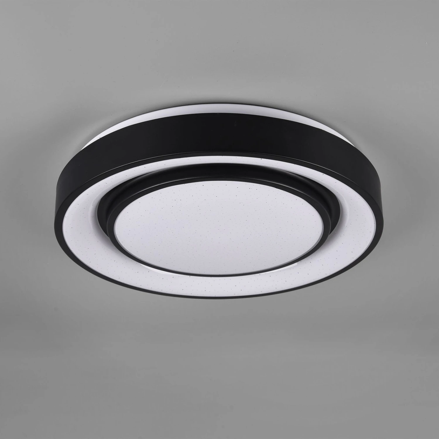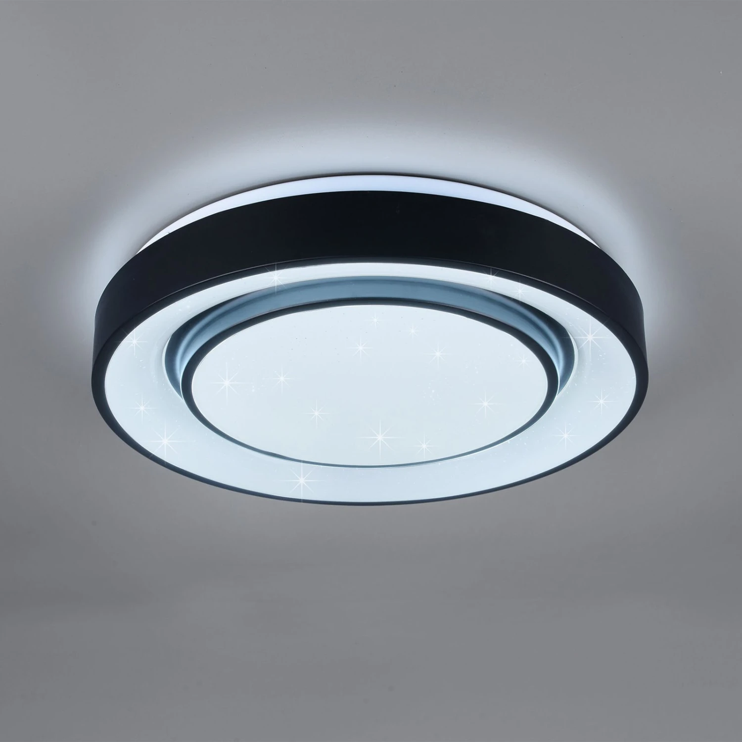 Die LED-Deckenleuchte Mona teilt sich optisch in zwei Lichtquellen auf – einen leicht hervortretenden inneren Kreis und einen äußeren Ring, die jeweils von einem umlaufenden, schwarzen Rahmen aus Metall umgeben sind. Der matte Kunststoff-Diffusor sorgt mit einem Starlight-Effekt für gewisse Etwas, um die Leuchte in den Fokus zu rücken. Die variable Beleuchtung, die durch RGBW-Farbwechsel, einstellbare Farbtemperatur, Memory-Funktion, Nachtlicht und Dimmbarkeit entsteht, lässt keine Wünsche offen. Somit sorgt die Leuchte für optimale Lichtverhältnisse, eine angenehme Atmosphäre und lässt sich in zahlreiche moderne Einrichtungskonzepte integrieren.
