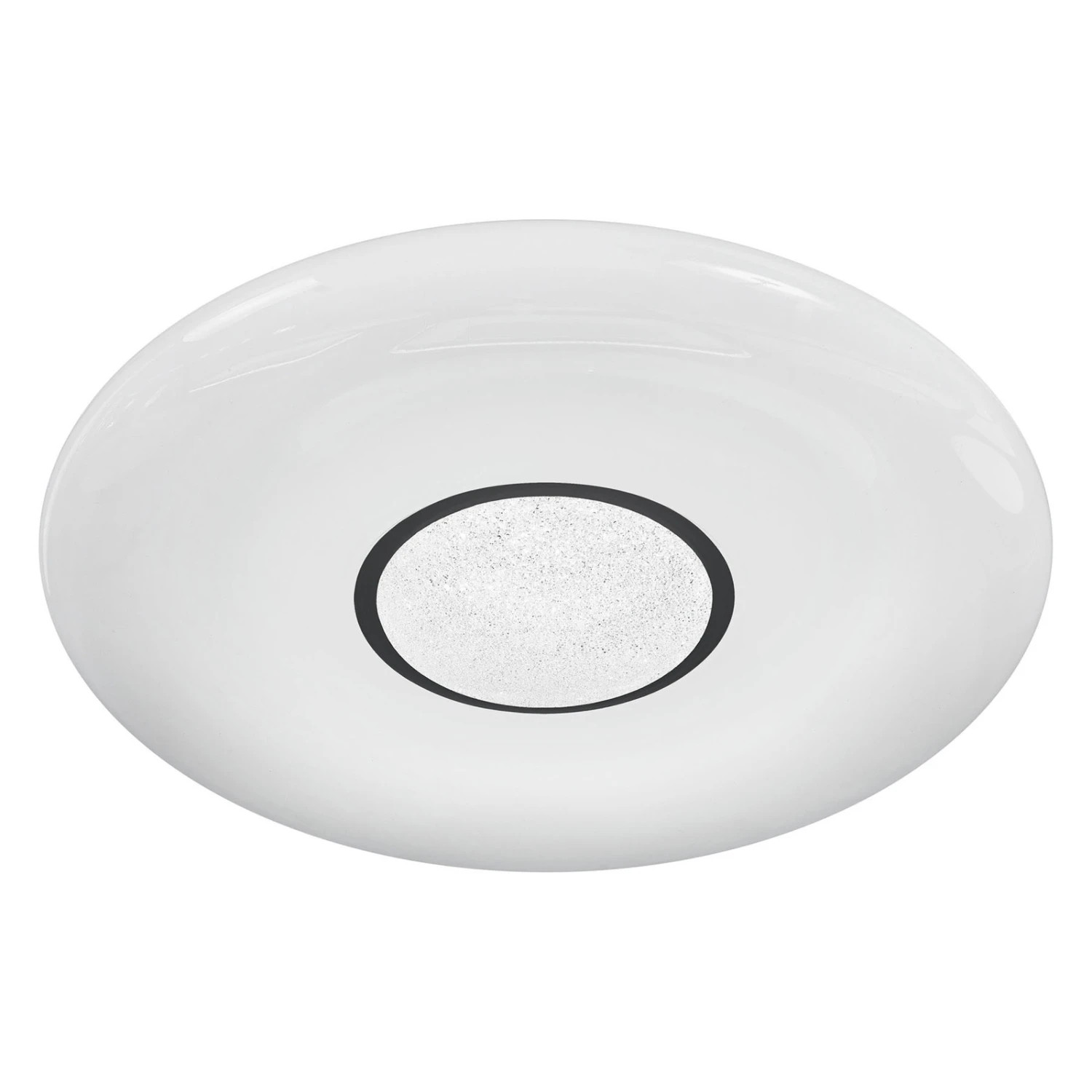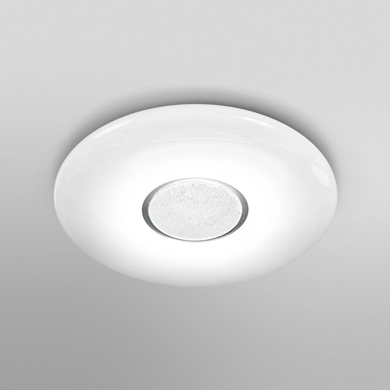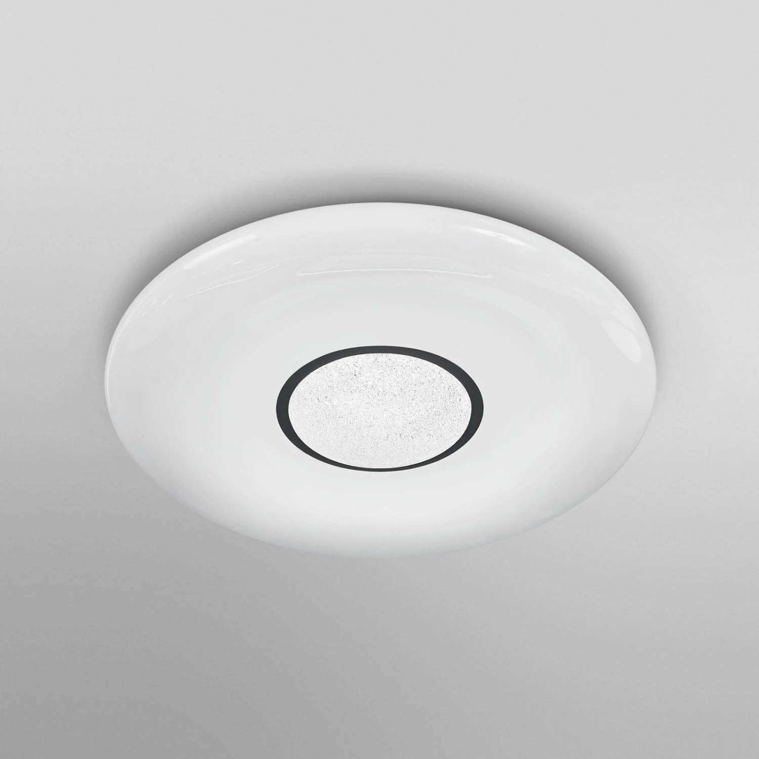 Mit ihrer breiten Ringform, die ein glitzerndes Zentrum umschließt, wirkt die LED-Deckenleuchte dekorativ und modern. Die Formgebung und der weiße PMMA-Kunststoff lassen das Licht gleichmäßig zu allen Seiten strahlen. Die Deckenleuchte kann per App oder Sprachbefehl gedimmt und in der Farbtempertatur geregelt werden. Die Koppelung mit dem Tablet/Smartphone erfolgt dank der LEDVANCE SMART+ WiFi-Technologie direkt über das WLAN – ohne Gateway oder Bridge.