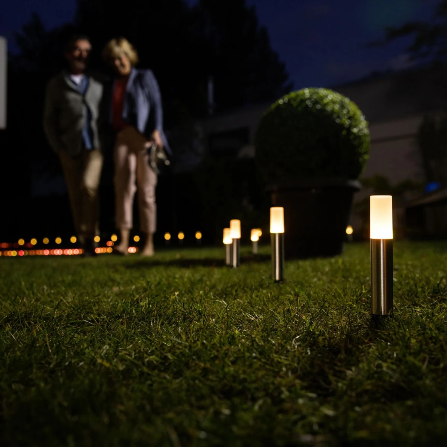 Das Basisset verfügt über 5 LED-Spots mit Erdspieß, die in einem Abstand von 0,5 m miteinander verbunden sind. Erweiterbar ist dieses Set auf bis zu 11 Spots.