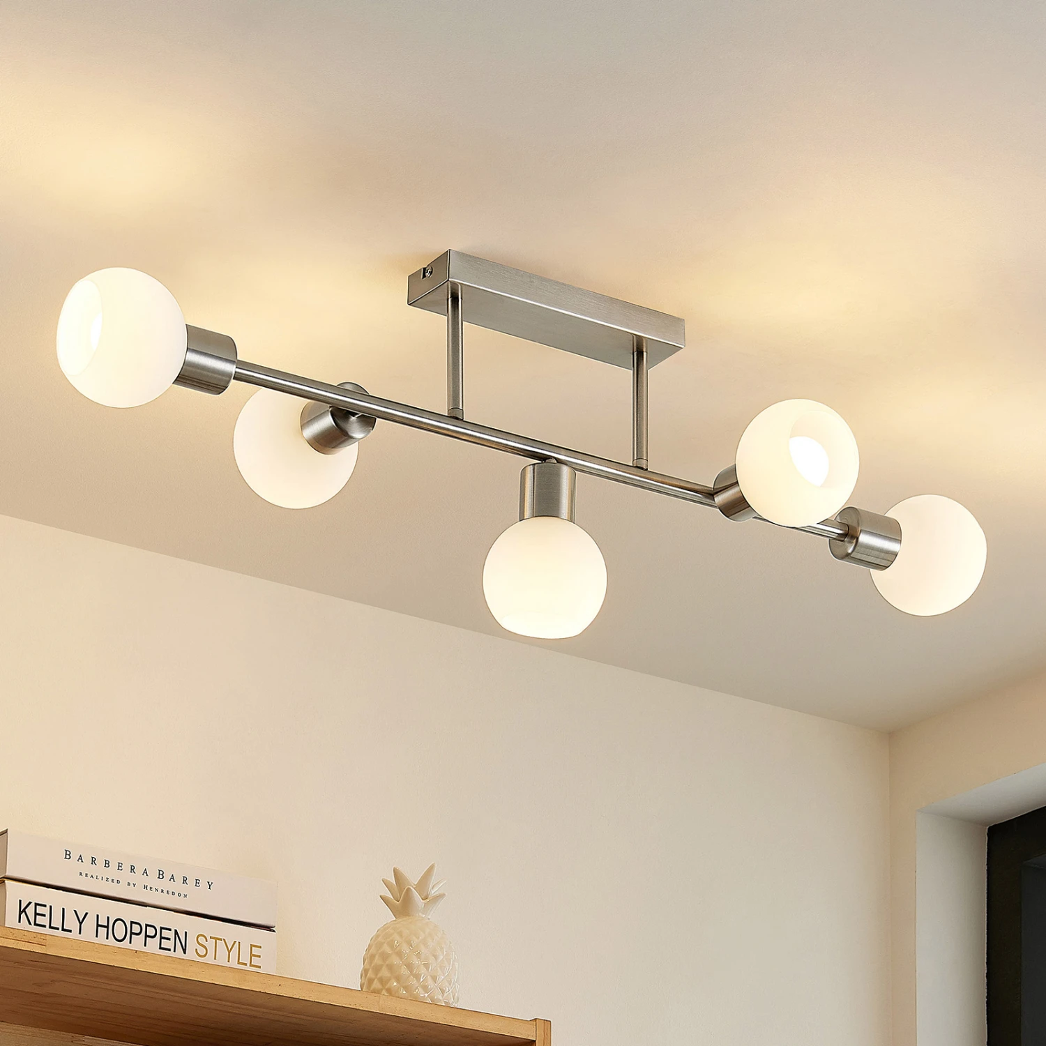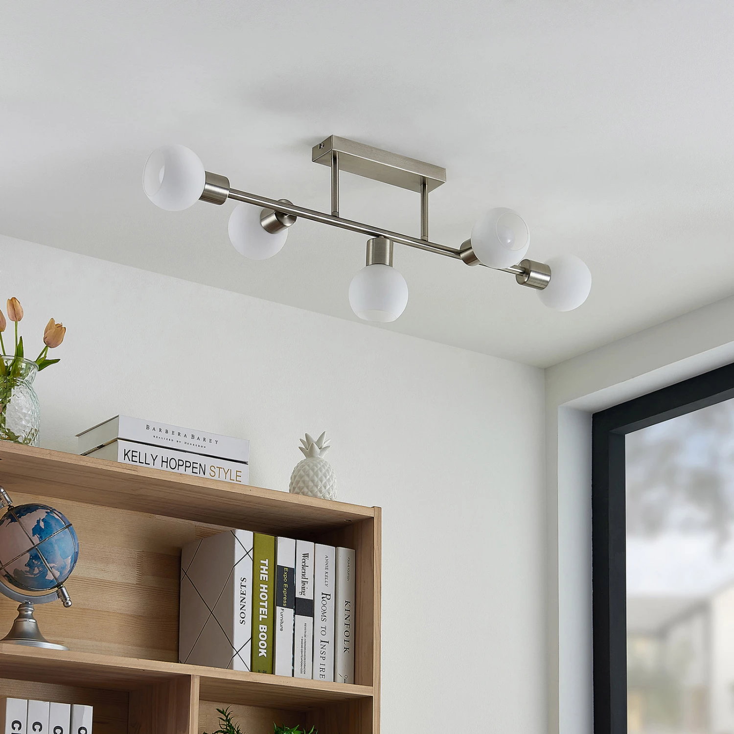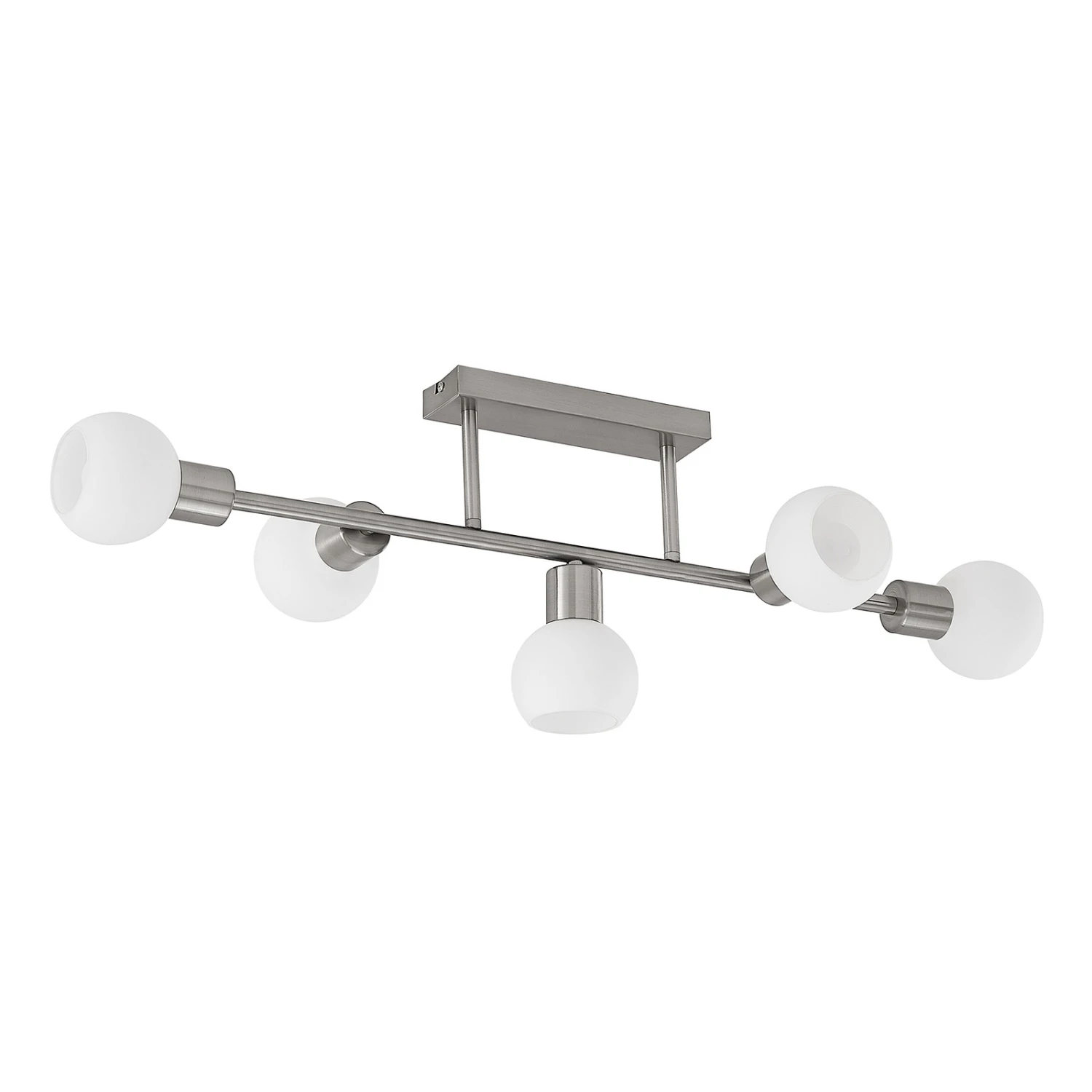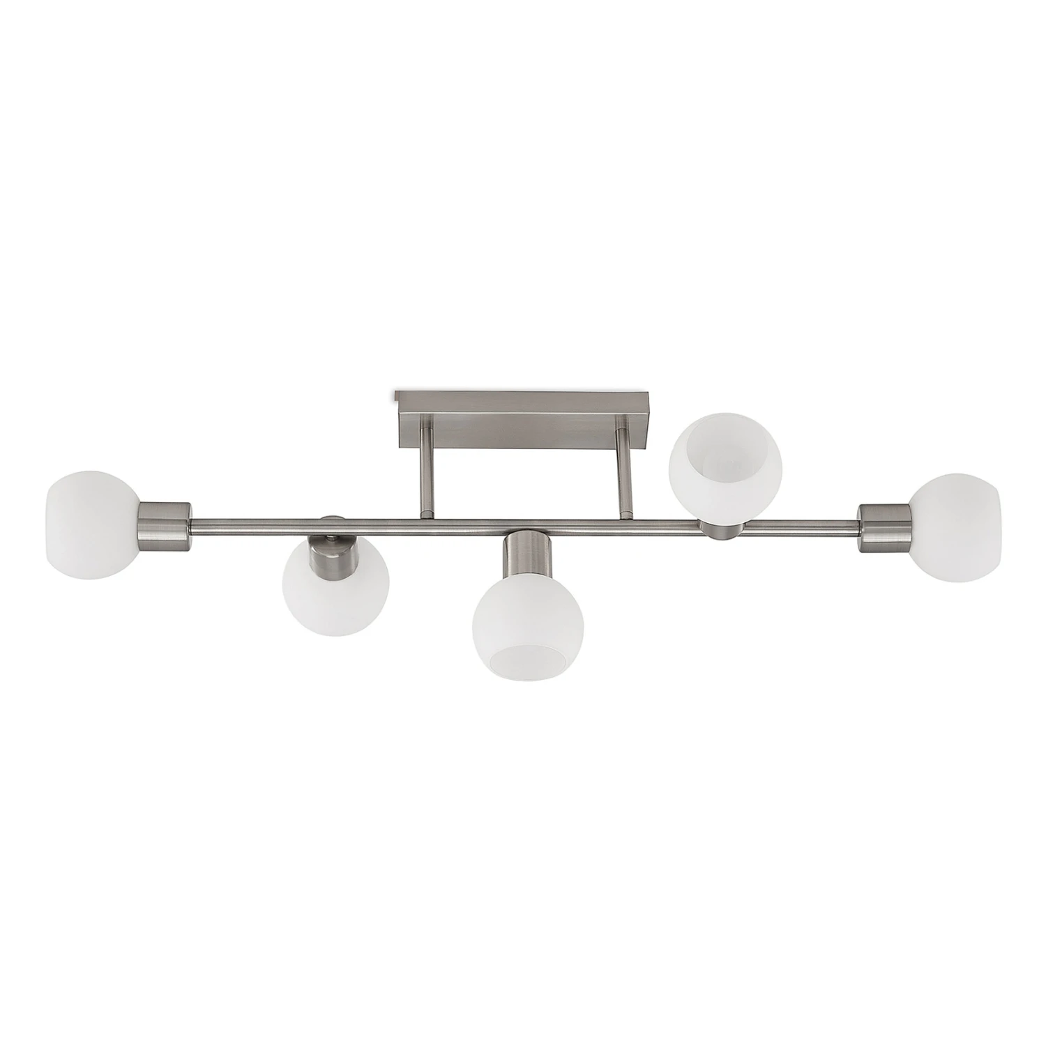 Biscala ist eine fünfflammige Deckenleuchte, die sich zur Beleuchtung größerer Wohnräume oder langer Flure besonders gut eignet. In alle Richtungen zeigend, wurden an dem Stahlgestell mit Finish in Nickel satin E14-Fassungen angeordnet. Die darin sitzenden Leuchtmittel werden von opalweißen, fast kugelförmigen Schirmen aus Glas umgeben, durch die das Licht blendfrei und gleichmäßig abstrahlt. Modern und gleichermaßen zeitlos, passt die Leuchte in die unterschiedlichsten Einrichtungen und kommt so schnell nicht aus der Mode. Die Leuchte kann mit entsprechenden Leuchtmitteln bestückt werden.