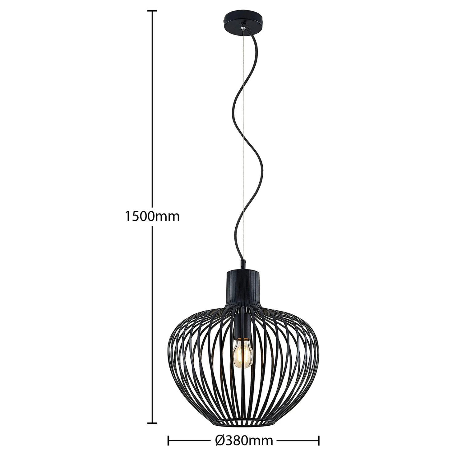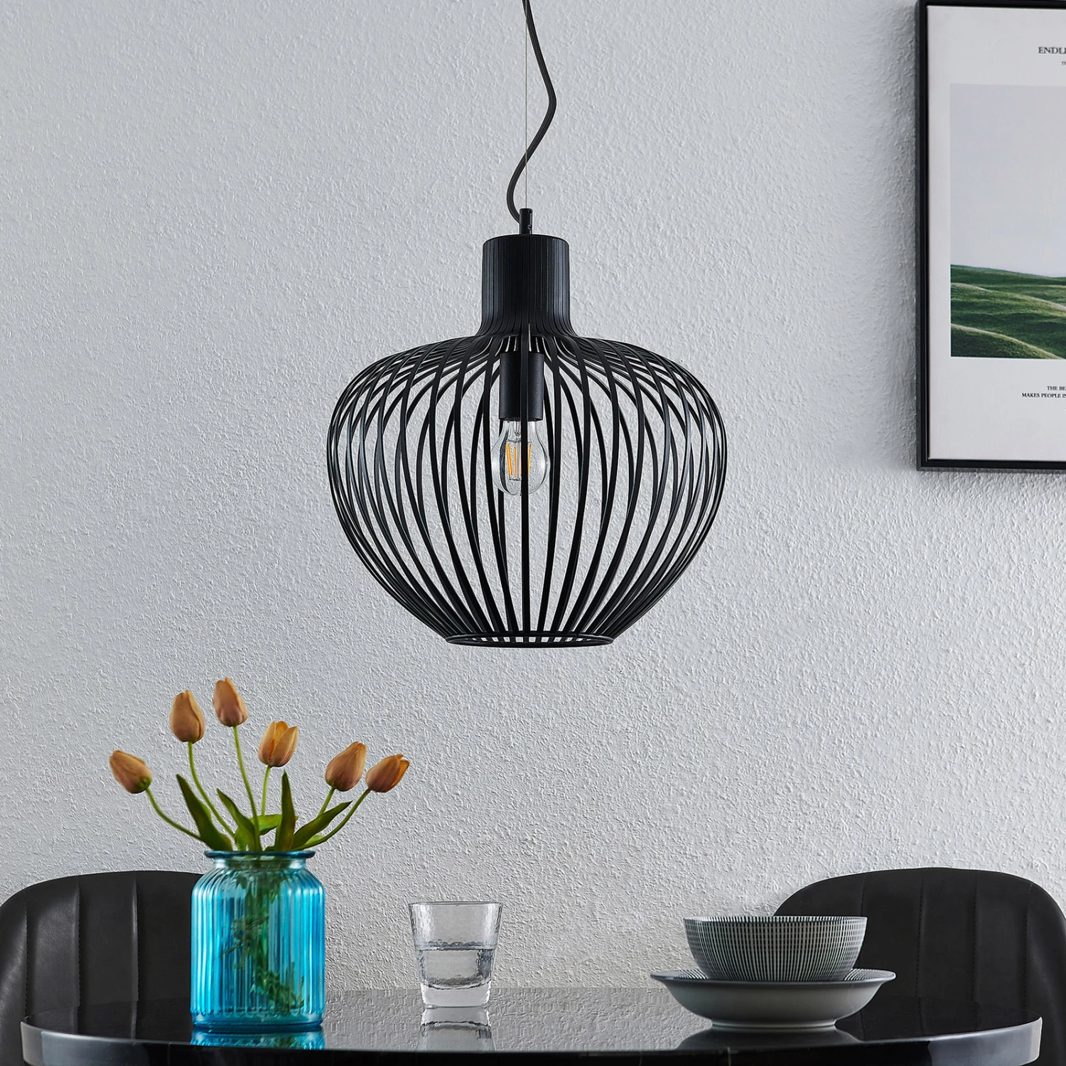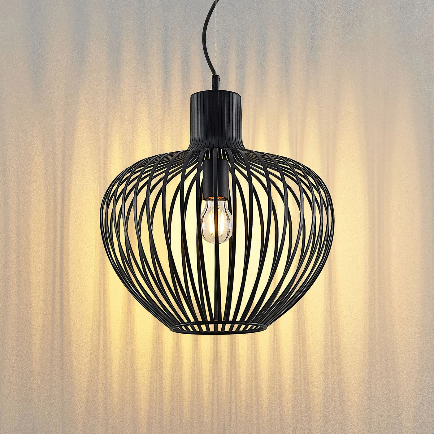 Die Hängelampe Deandre besitzt einen markanten Leuchtenschirm in Käfig-Optik und generiert eine ganz besondere Beleuchtung. Sie ist aus Stahl hergestellt und präsentiert sich in einer schlichten sandschwarzen Farbgebung, die das Design der Leuchte abrundet. Ihr Schirm wird mit entsprechenden Leuchtmitteln bestückt und bietet somit die Möglichkeit die Lichtintensität und Lichtfarbe an die persönlichen Bedürfnisse anzupassen. Die Hängeleuchte Deandre findet ihren perfekten Platz in einem Wohnzimmer oder Esszimmer und verbreitet hier ein spannendes Lichtspiel, da die schlanken Streben des Schirmes das Licht brechen.