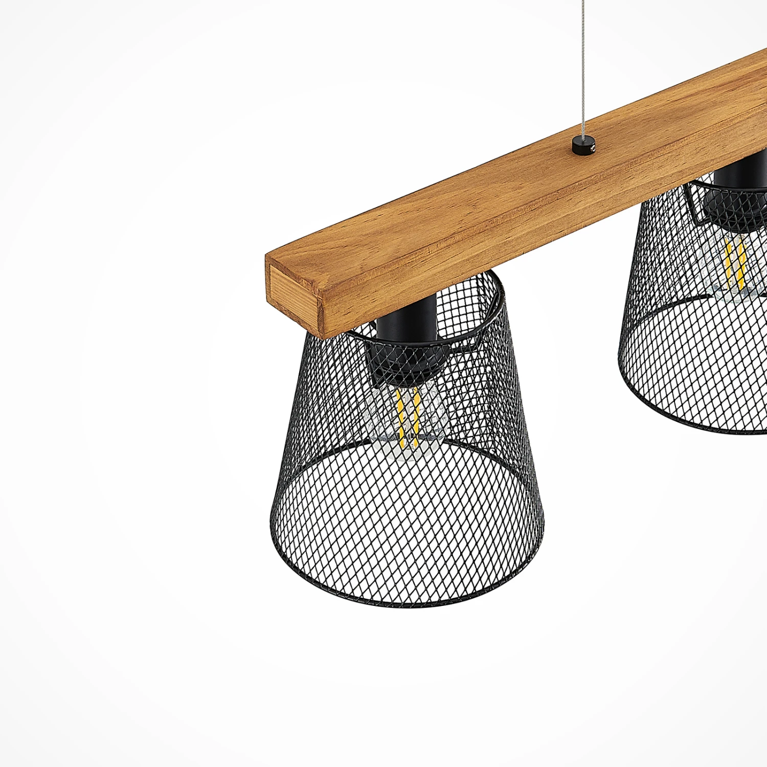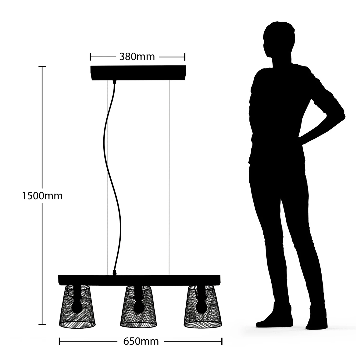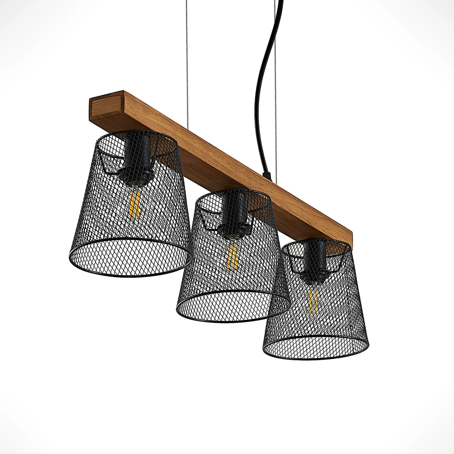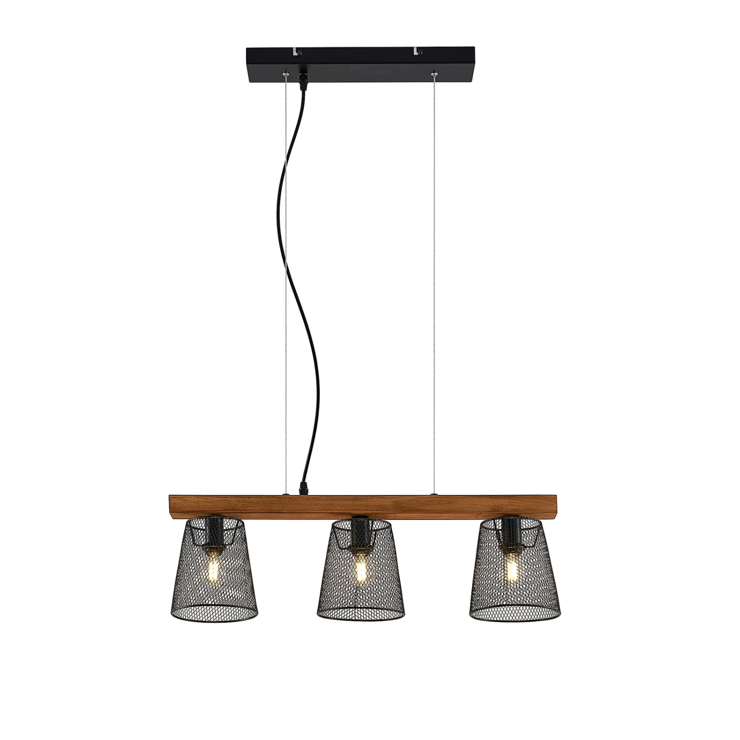 Die Hängeleuchte Morlin überzeugt mit ihrem außergwöhnlichen Aussehen. Sie besteht aus einer länglichen Strebe aus Kiefernholz, die an einer dezenten Aufhängung angebracht ist. An dieser sitzen drei Leuchtenschirme aus dunklem Stahl, welche horizontal positioniert sind und mit ihrem Aussehen an Käfige erinnern. Die Lichtquellen im Inneren sind einzusetzende Leuchtmittel, deren Licht durch die Lücken innerhalb der Schirme ein interessantes Lichtspiel generieren. Die auffallende Hängeleuchte Morlin ist die perfekte Lösung, wenn man das Ess- oder Wohnzimmer zuverlässig ausleuchten und dazu noch einen prägnanten Eindruck vermitteln möchte. Die dezente Farbgebung von dunklem Stahl und Holz ermöglichen ein Einbringen in moderne Einrichtungsstile und runden das Mobiliar wohlwollend ab.