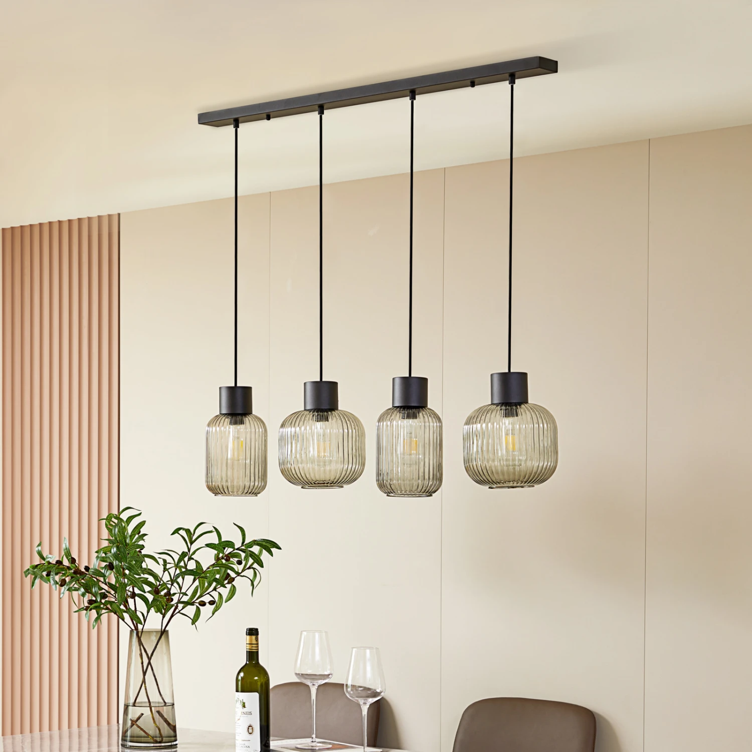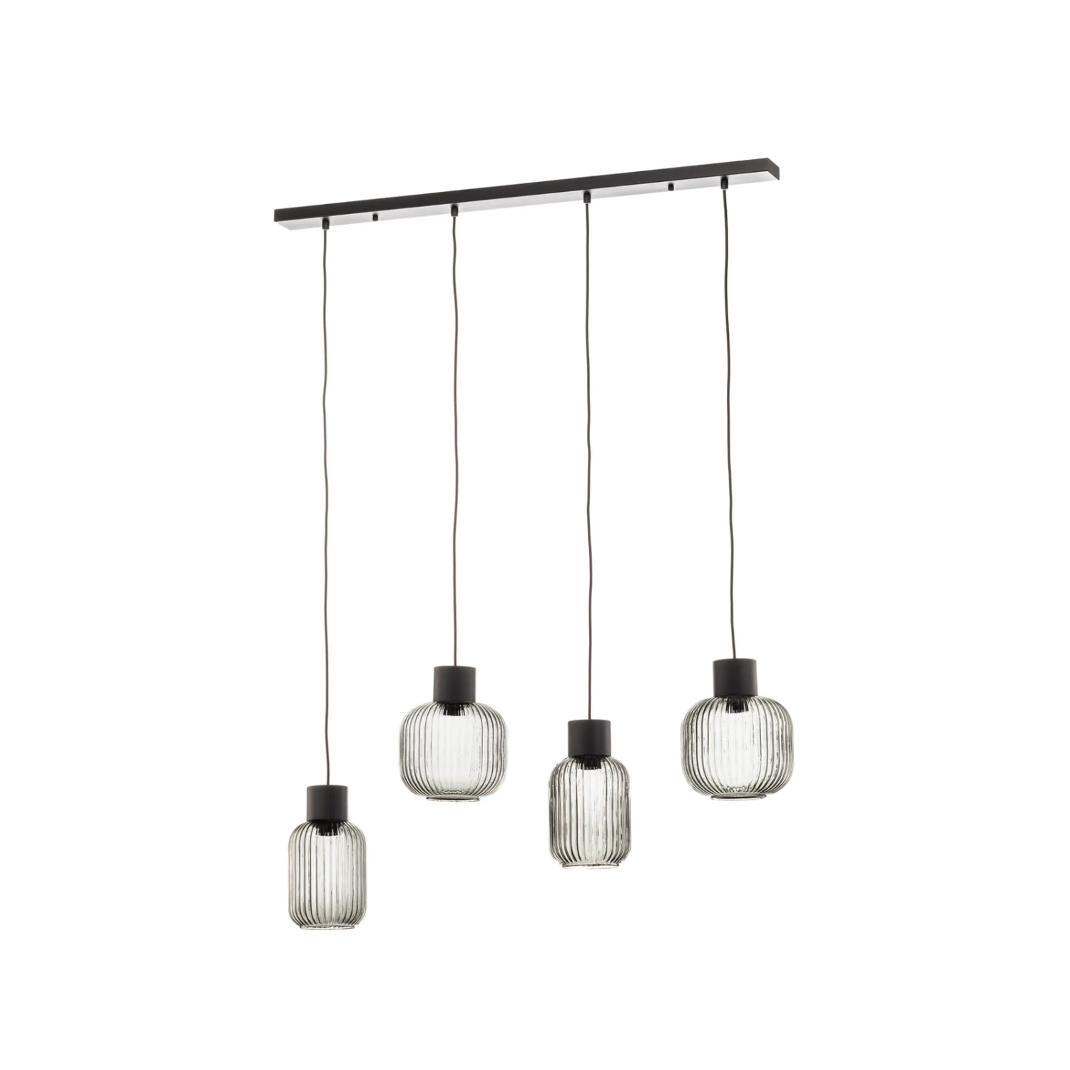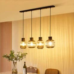 Lomeris ist eine Hängeleuchte, die sich gut über einem Esstisch platzieren lässt mit ihrer länglichen Form und den vier getönten Lampenschirmen aus Glas. Dabei weichen je zwei Schirm in der Form voneinander ab, zwei sind eher bauchig, die zwei anderen schmaler und etwas länger. Allen gleich ist jedoch die rauchgraue Tönung und die Rillenstruktur im Glas, wobei beide nicht nur Einfluss auf die Optik nehmen, sondern auch das Lichtbild ansprechend gestalten, das dann ein gewisses Funkeln bekommt sowie eine warme und gemütliche Ausstrahlung. Da es sich um Klarglas handelt, das zwar getönt ist, aber dennoch durchsichtig, kann man die eingesetzten Lampen noch relativ gut erkennen und sollte darauf achten, dass sie möglichst passend und dekorativ aussehen, wie es auf alle LED-Filamentlampen mit Glaskolben zutrifft, die zudem in der Regel auch noch effizient in Hinsicht auf Verbrauch und Helligkeit sind.