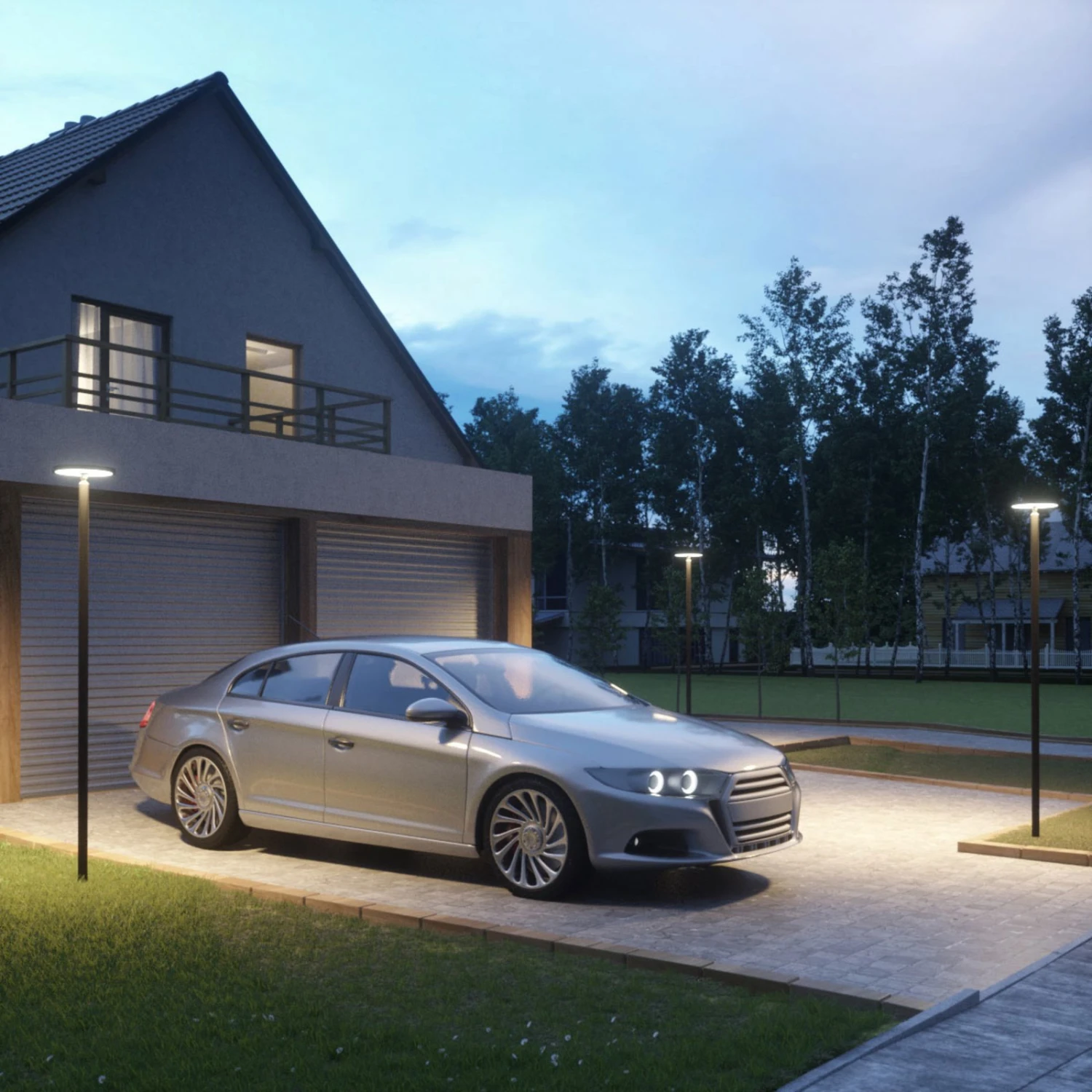 Diese LED-Mastleuchte eignet sich gut für eine Beleuchtung von größeren Gärten und Parkanlagen. Dabei erscheint sie sehr modern, am oberen Ende des Mastes befindet sich ein runder Ring, der mit zahlreichen LEDs bestückt ist und wie der Rest der Mastleuchte dunkelgrau lackiert wurde. Die Leuchtkraft der Leuchte ist besonders gut, so dass man sich auch in etwas weiterer Entfernung noch relativ gut orientieren kann.