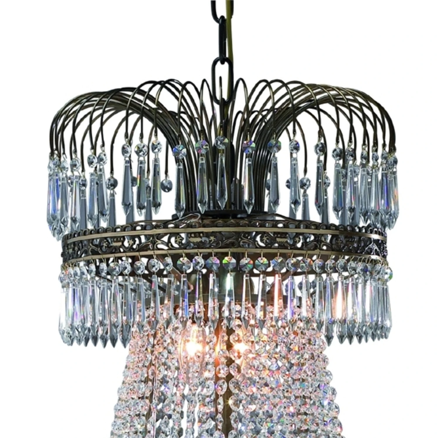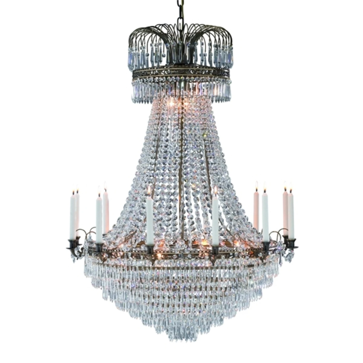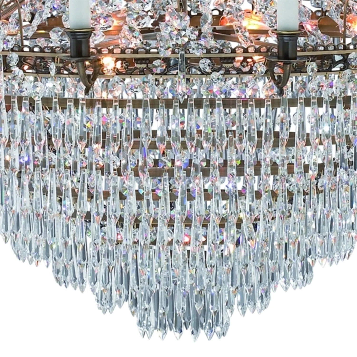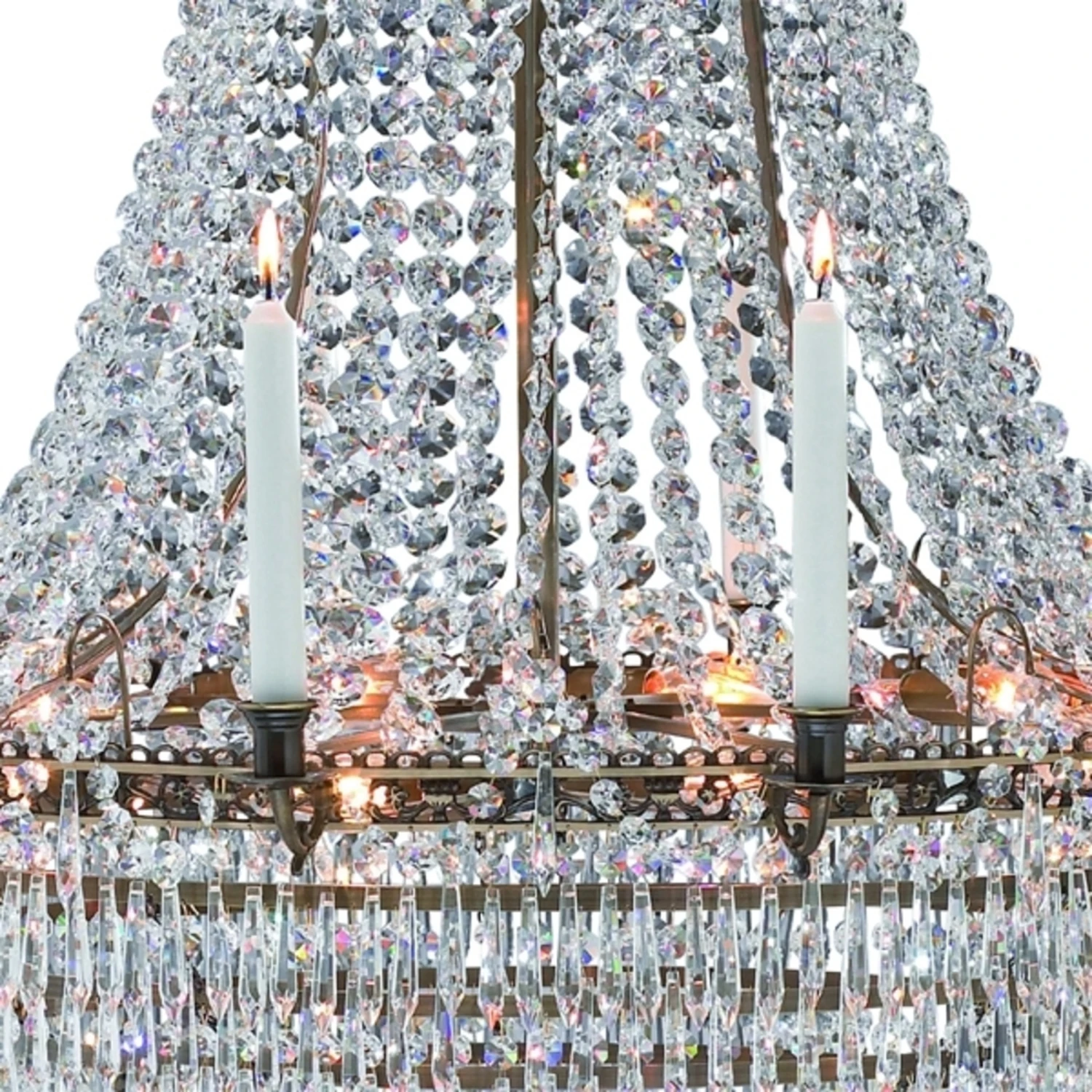 Dieser Kerzen-Kronleuchter ist ein wahres Schmuckstück. Der in verschiedenen Größen erhältliche Metallrahmen verleiht dem Leuchter sein klassisches Design. Unzählige Kristalle veredeln das Erscheinungsbild des Kerzen-Kronleuchters zusätzlich und sind außerdem für glanzvolle Beleuchtungseffekte verantwortlich. Zusätzlich abgerundet wird die imposante Erscheinung durch Kerzenhalter, in denen schlanke Stabkerzen für einen harmonischen Ausgleich sorgen. Auch ausgeschaltet verzaubert dieser Kronleuchter jeden Raum und ist ein wunderschöner Blickfang.