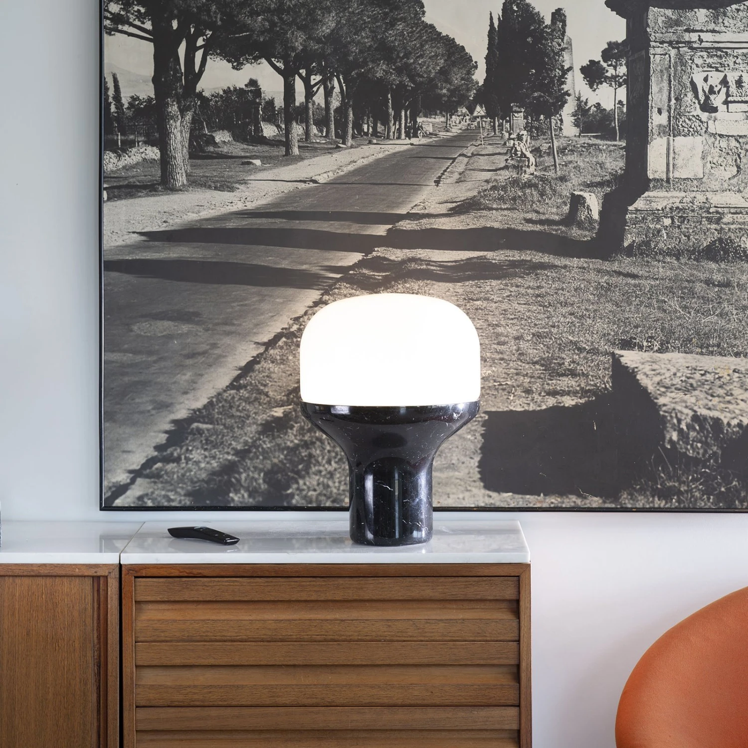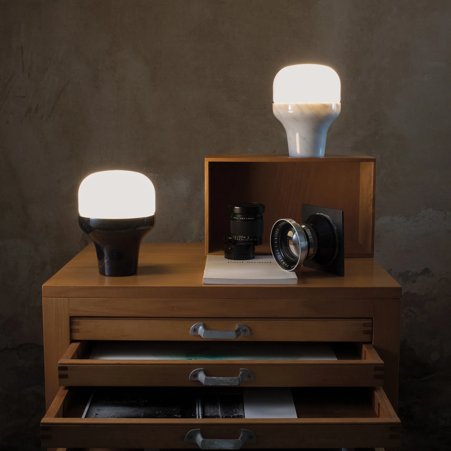 Elegant und luxuriös wirkt die Tischleuchte Delux mit ihrem charakteristischen Materialmix. Der aus Marmor gearbeitete Fuß ist an der Basis zylindrisch geformt und nimmt nach oben an Umfang zu. Hier geht der Fuß beinahe nahtlos in den Schirm über. Letzterer besteht aus geblasenem Opalglas und ist schließt nach oben mit einer harmonischen Rundung ab. Der Schirm sorgt für eine gleichmäßige Lichtbrechung, sodass Delux die Umgebung zu allen Seiten mit einem angenehm sanften Licht erfüllt.