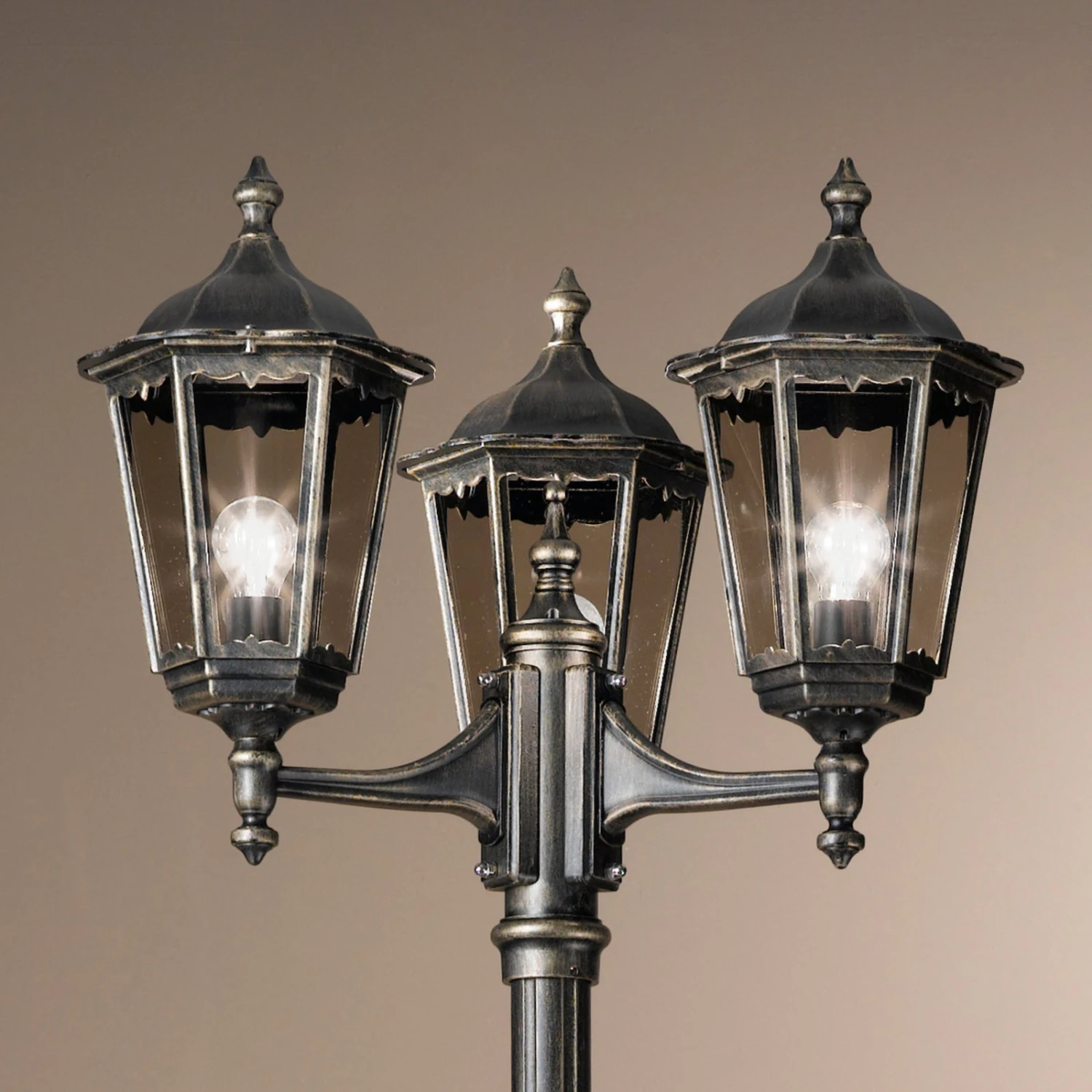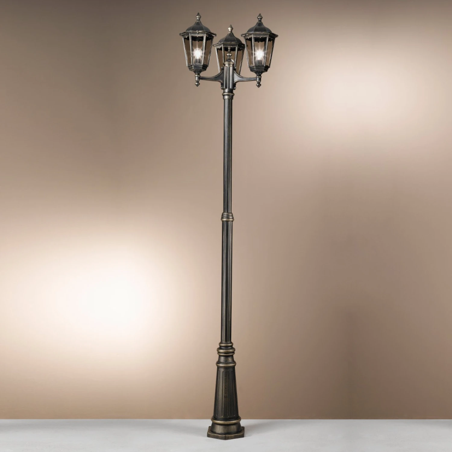 Eine gute und sichere Beleuchtung des Außenbereichs in der Nacht ist sehr wichtig. Die Mastleuchte Puchberg leuchtet den Außenbereich sicher aus, und steigert auf diese Weise nicht nur die Sicherheit, sondern setzt auch einen ansprechenden Akzent. Die Glasscheiben sind in Rauchgrau gehalten und um ein Gestell in Schwarz-Gold ergänzt.