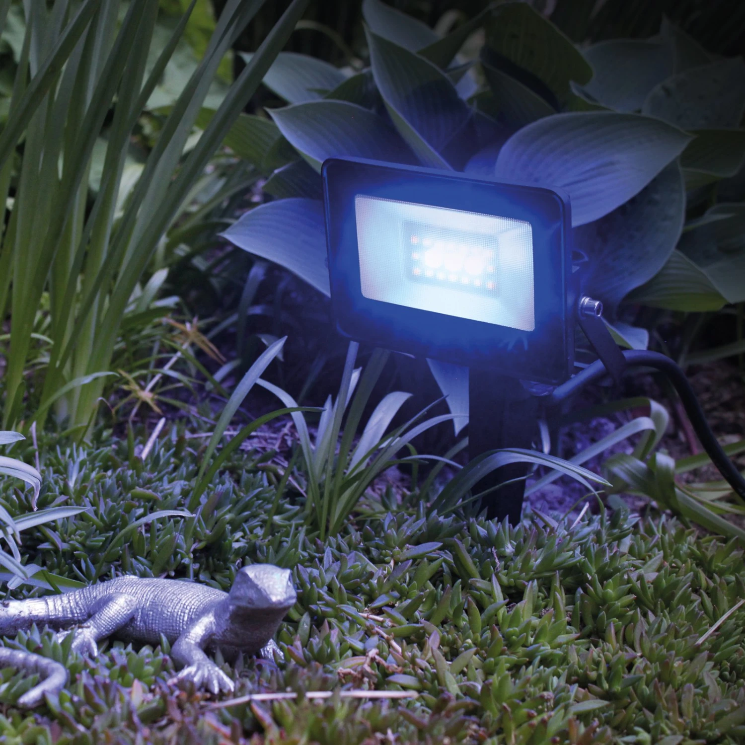 Mit dem Außenstrahler MT69070 ist sowohl eine warmweiße als auch eine farbige Beleuchtung aus 15 voreingestellten RGB-Farben möglich, die Auswahl der Lichtfarbe kann jederzeit mit der im Lieferumfang enthaltenen Infrarot-Fernbedienung erfolgen. Der Strahler aus Aluminium und Glas ist mit einem schwenkbaren Leuchtenkopf zur individuellen Ausrichtung ausgestattet und mit einem 30 cm langen Anschlusskabel bestückt.