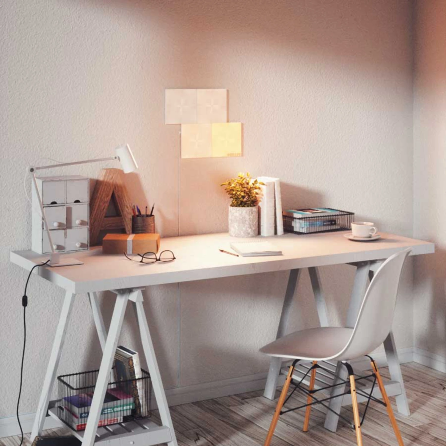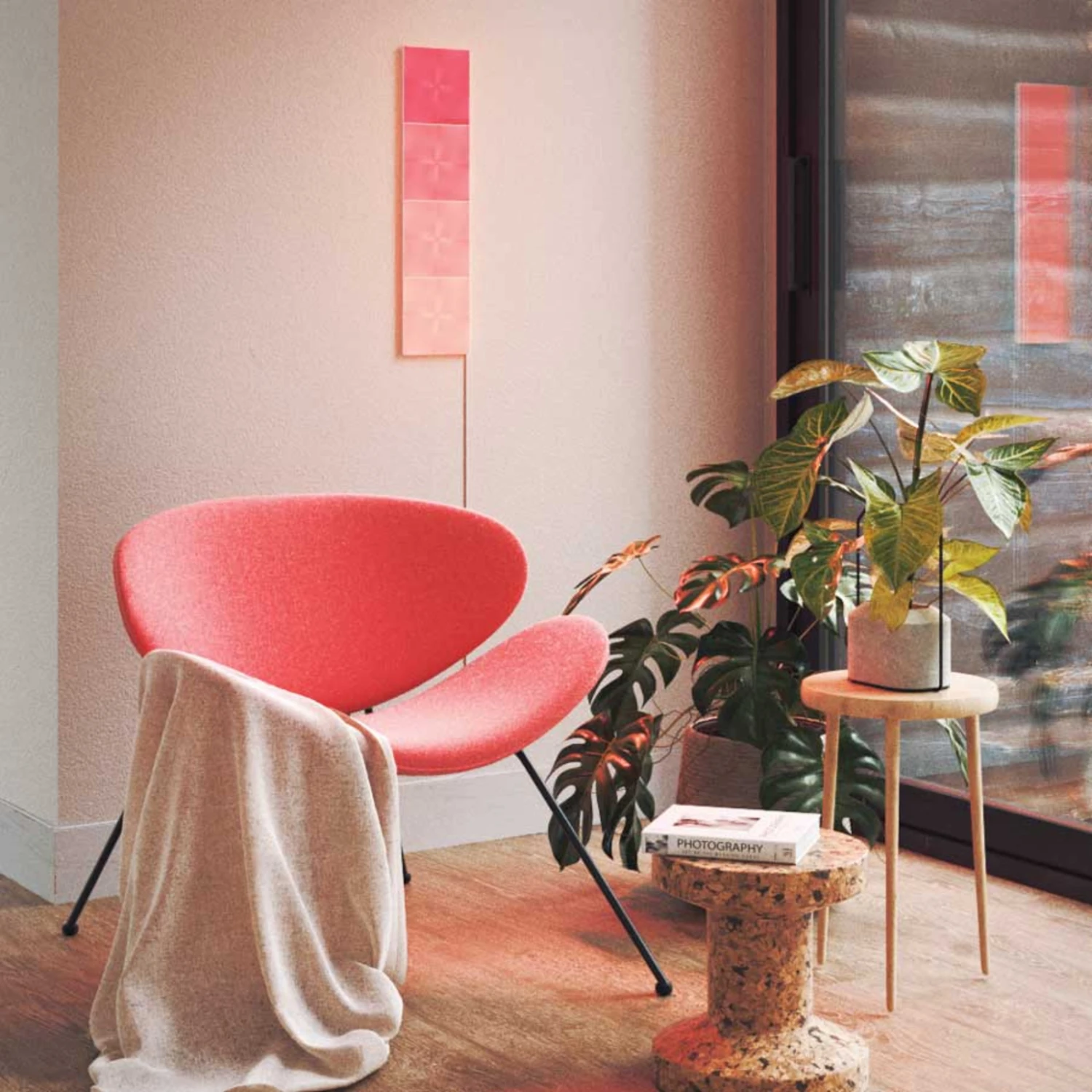 Die LED-Wandleuchte Canvas von Nanoleaf bietet dank des modularen Aufbaus die Möglichkeit, eine individuelle dekorative Beleuchtung zu kreieren. Die vier Quadrate des Sets werden mit den beiliegenden Steckverbindungen in beliebiger Anordnung zusammengefügt.