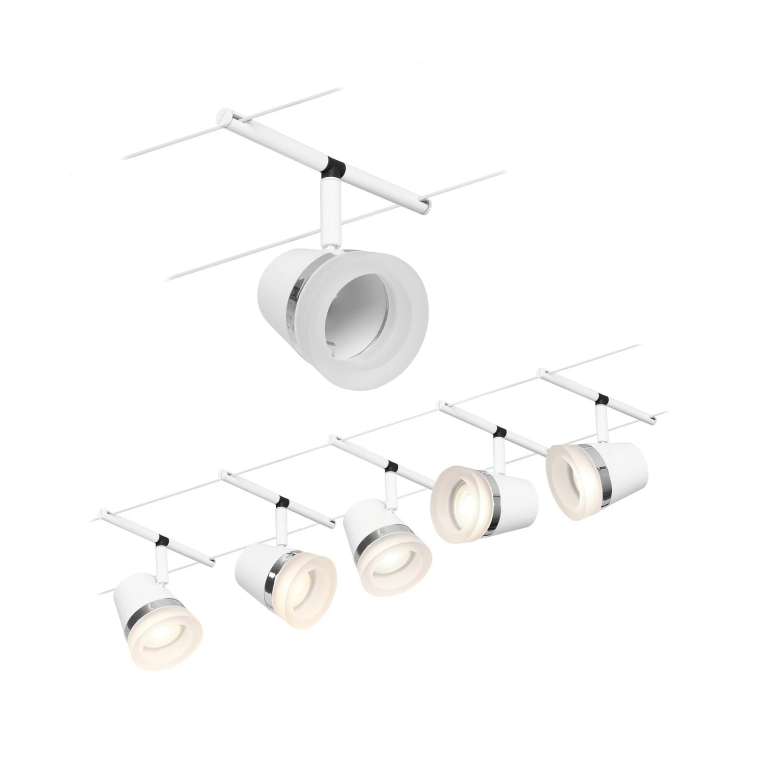 Mit dem Seilsystem Cone LED lässt sich jeder Raum effektiv und vor allem flexibel beleuchten. Ob gerade angebracht, an der Deckenschräge oder verwinkelt montiert – Seilsysteme bieten grenzenlose Gestaltungsmöglichkeiten und passen in jeden Raum. Das System besteht aus dem Seil, einem Trafo und fünf Leuchten, die sich beliebig am Seil anordnen lassen. Sie sind in leicht konisch zulaufender Form gestaltet und mit einem glänzenden Zierring sowie einem satinierten Ring an der Öffnung gearbeitet und lassen sich schwenken und drehen, so dass ihr Licht bis in jede Ecke eines Raumes reicht und sich verschiedene Raumbereiche oder Einrichtungsgegenstände gezielt beleuchten lassen.