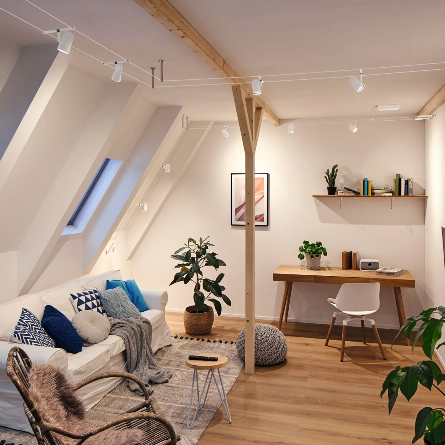 Seilsysteme lassen sich in den unterschiedlichsten Räumen nutzen und bieten ein Höchstmaß an Gestaltungsmöglichkeiten. Das fünfflammige Seilsystem Cup kann an der Decke, an einer Dachschräge und sogar an einer Wand montiert werden und ist damit ein Problemlöser für schwierige Installationsbedingungen. Durch die am Seil flexibel ausrichtbaren Spots und deren Dreh- und Schwenkbarkeit lässt sich die Lichtstrahlung bis in jeden Winkel eines Raumes oder eines langen Flures lenken und es können gezielte Akzente mit Licht gesetzt werden.