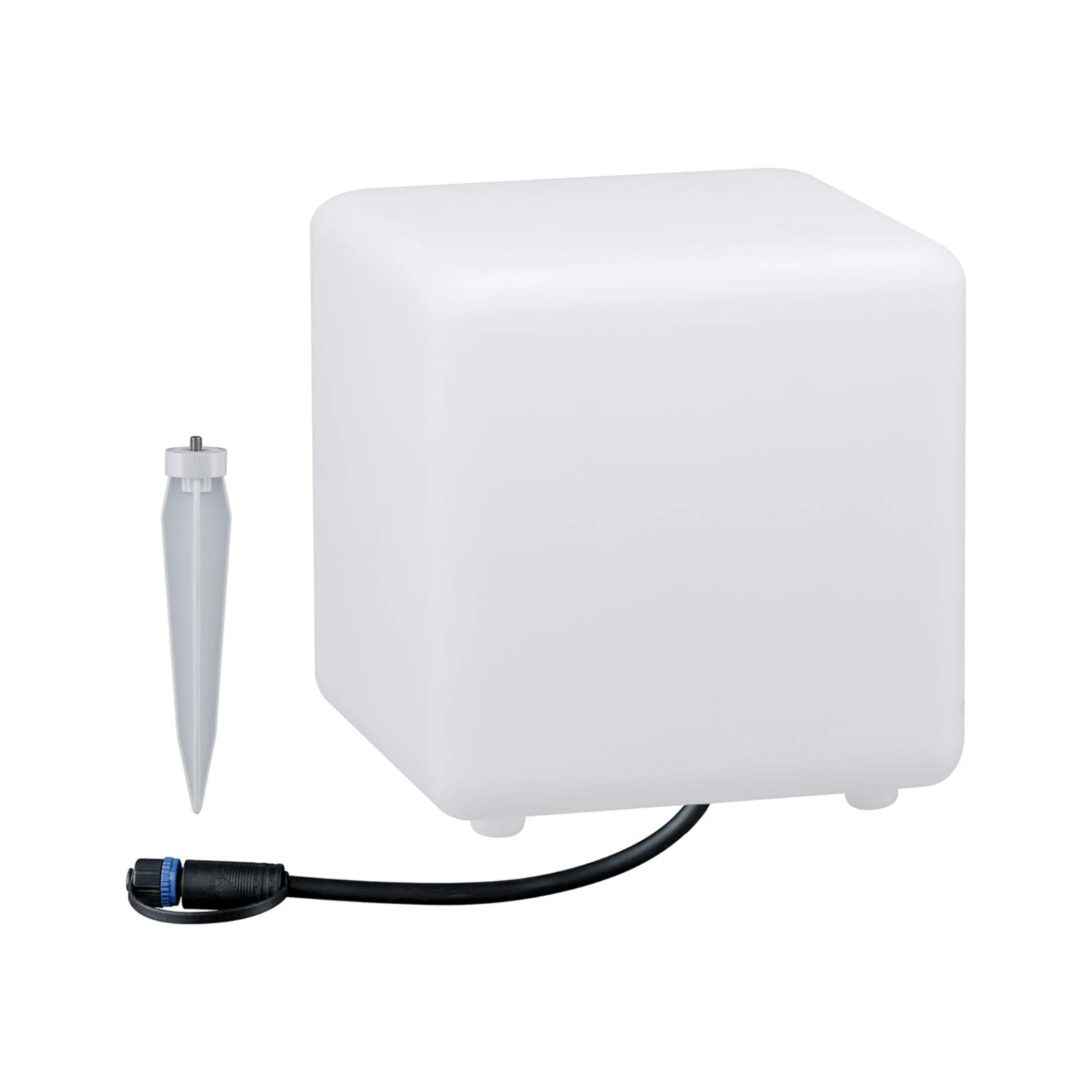 Ob auf der Terasse oder im Garten – die wasserdichte Dekoleuchte Cube bereichert den gewünschten Ort mit einem Lichtakzent. Bei Bedarf ist die Verankerung mit dem beiliegenden Erdspieß möglich. Der Kubus aus weißem, transluzentem Kunststoff harmoniert optisch mit modern gestalteten Außenbereichen.
