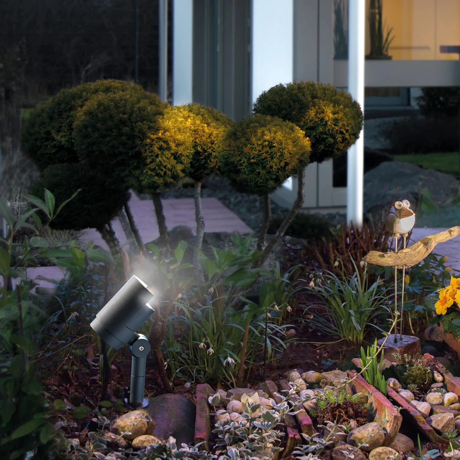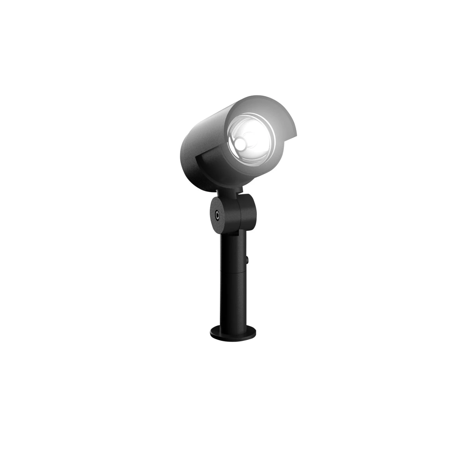 Der LED-Erdspießstrahler 207 überzeugt mit flexiblem Licht zur Betonung von Skulpturen, Fassaden, Bäumen etc. auf der Außenanlage. Der zylindrische Kopf mit Blende kann dank des Gelenks am Arm ausgerichtet werden. Das Hochvolt-LED-Modul emittiert warmweißes Licht durch eine klare Glasabdeckung. Tagsüber bleibt der Strahler aus Aluminiumdruckguss mit seiner Pulverbeschichtung in Anthrazit-metallic optisch im Hintergrund.