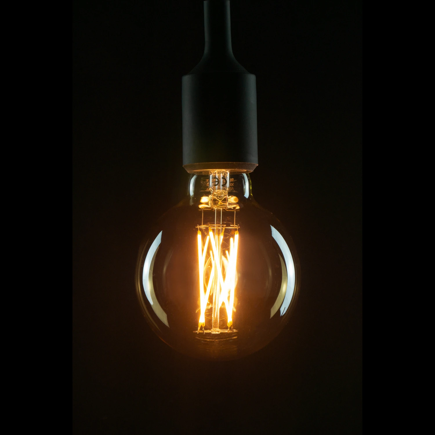 Die besonders warme Lichtfarbe und die schöne Optik mit golden getöntem Glas in Globeform und LED-Filamenten macht diese Globelampe zum idealen Leuchtmittel für offene Leuchten im Wohnbereich. Die Helligkeit lässt sich mit den meisten gängigen Dimmern regulieren.