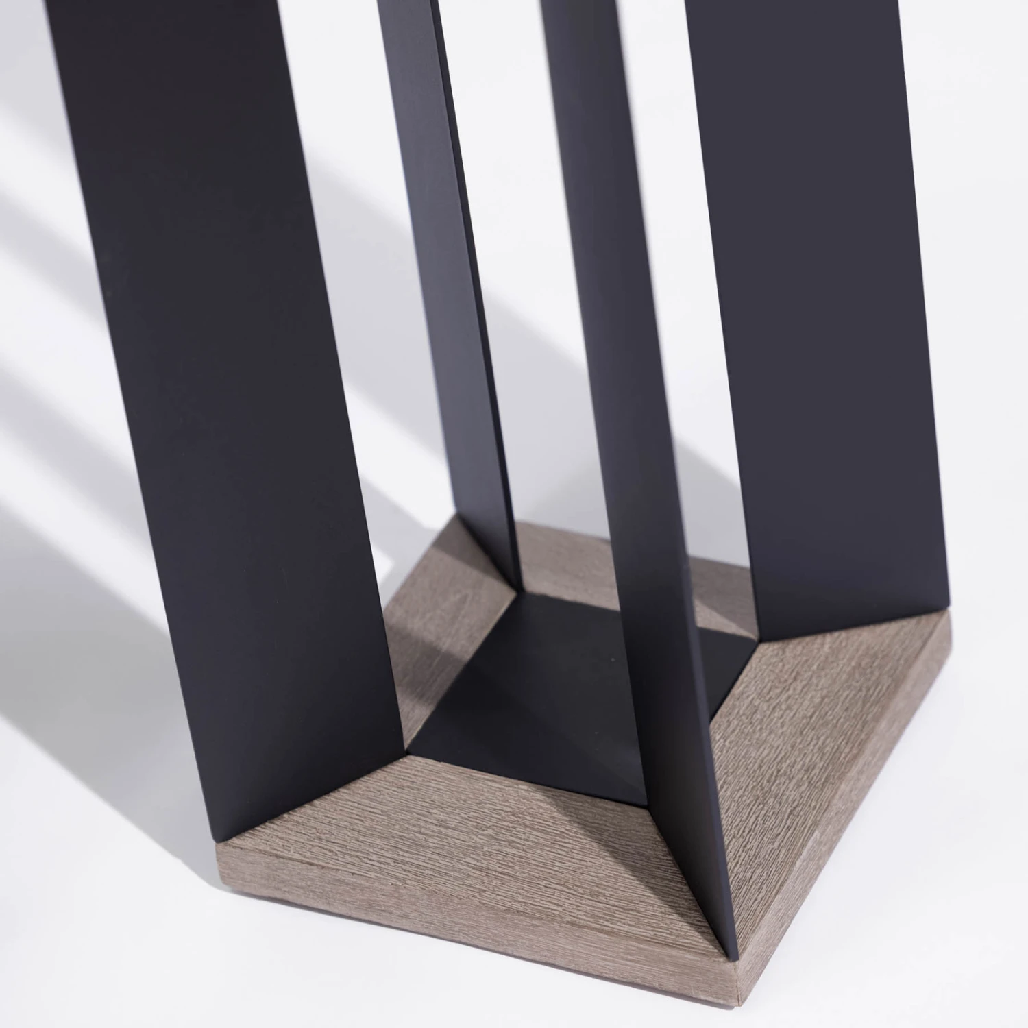 Das Teakholz ist äußerst pflegeleicht. Es wurde zuerst zuerst kräftig gebürstet, um ein strukturiertes Finish zu erhalten. Nach einer ersten Schicht wasserfester Grundierung wurden dann fünf Schichten graues Finish aufgetragen. Dieser Prozess schützt das Holz vor Witterungseinflüssen, UV-Strahlen und verschiedenen Flecken wie Wein, Kaffee oder Öl. Die graue Farbe unterstreicht den zeitgenössischen Chic. Wartung: Nicht ölen. Mit Seifenwasser reinigen.
