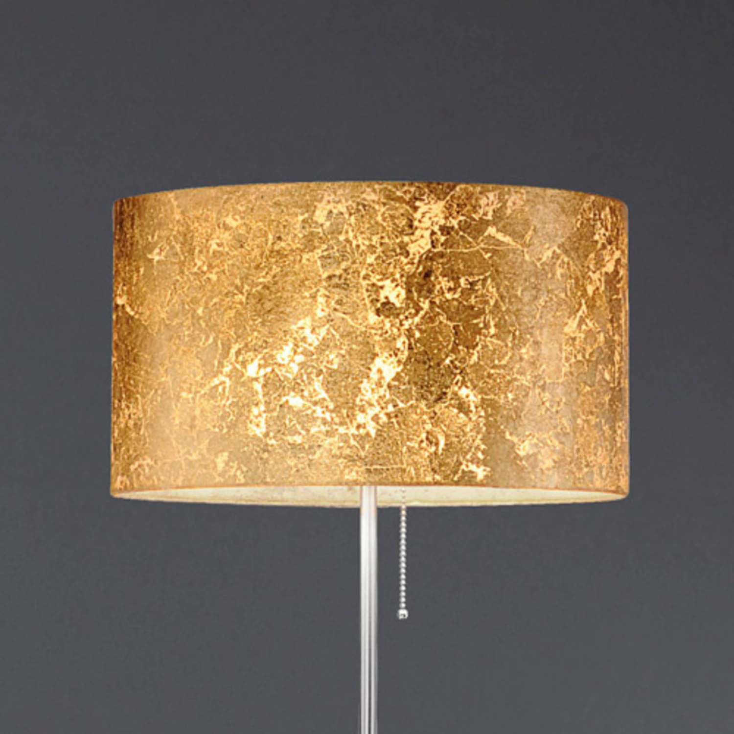 Die Stehleuchte Alea Loop ist ein herrlicher Blickfang mit ihrem goldenen Leuchtenschirm. Durch ihre praktische Höhenverstellbarkeit hat sie eine Höhe von 115 cm bis 160 cm. Die Außenseiten des runden Schirms sind mit edlem Blattgold belegt. Dadurch entsteht ein filigranes Lichtspiel mit prächtigen Glanzeffekten. Drei E27-Leuchtmittel liegen im Inneren. Oben im Leuchtenschirm befindet sich ein Diffusor aus Acrylglas, der Blendungen verhindert. Die Beleuchtungsatmosphäre wird von einem warmtönigen Licht geprägt. Die Stehleuchte selbst wertet mit ihrem Goldschirm das gesamte Ambiente auf. Sie entfaltet ihre ganze Wirkung in einem eleganten Umfeld mit einem Hauch von Purismus – beispielweise in Kombination mit weißen Ledermöbeln und spartanischem Dekor. Hier setzt Alea Loop einen fantastischen Effekt und erhöht die Feinheit puristischen Stilbewusstseins. Sie eignet sich aber ebenso als edle Zusatzleuchte in vielen anderen Einrichtungsstilen. Deutsche Qualitätsleuchte. Über den Zugschalter lassen sich die drei Lichtquellen getrennt voneinander schalten (1, 2 oder alle 3).