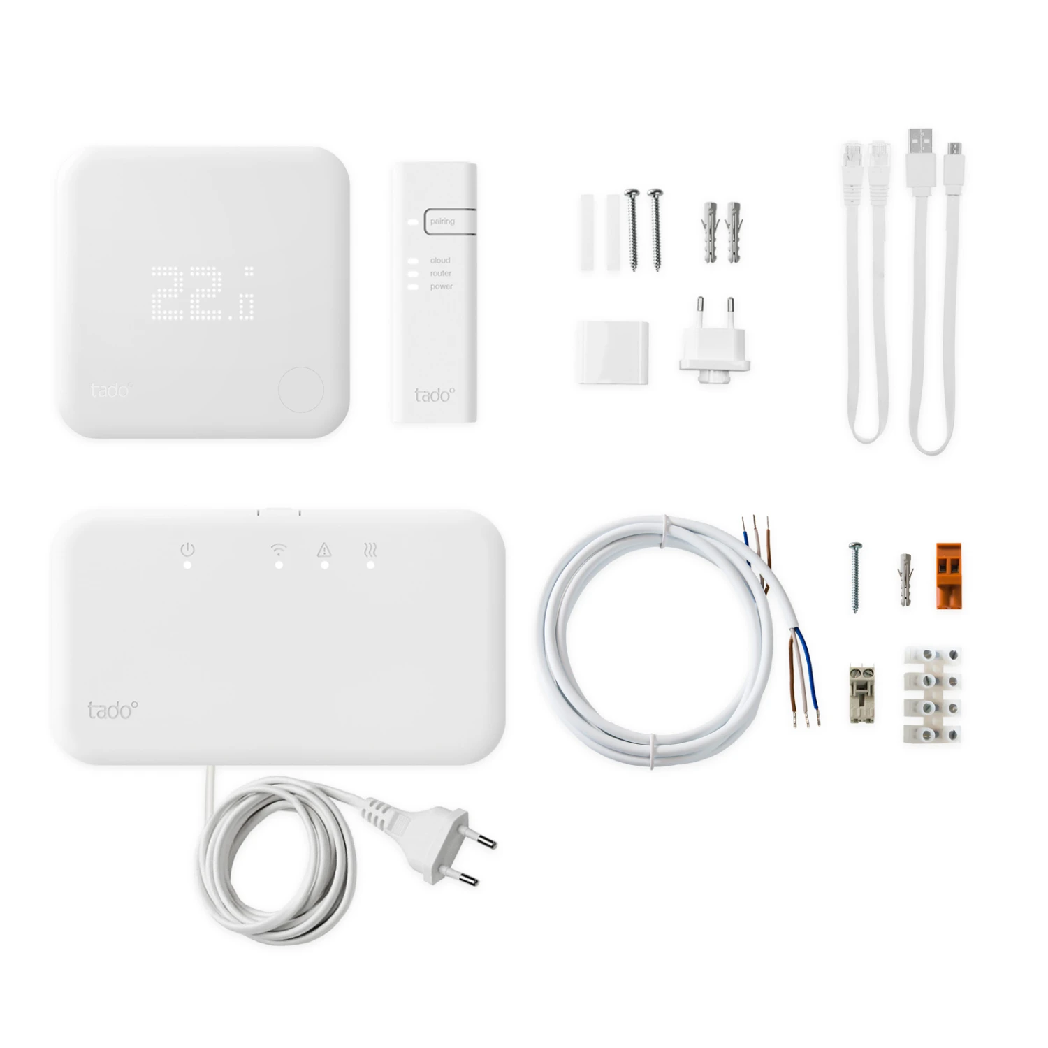 – Lieferumfang: tado° Funk-Temperatursensor, tado° Funk-Empfänger, tado° Internet-Bridge, 3 AAA Batterien, 2 x 2 Wandontageschrauben, 2 x 2 Dübel, 2 Klebepads, 3-adriges Kabel, 2 Isolatoren, USB-Kabel, Netzadapter, USB-Stromversorgung, USB-Kabel, Ethernet-Kabel, Handbücher und Setup-Anleitung