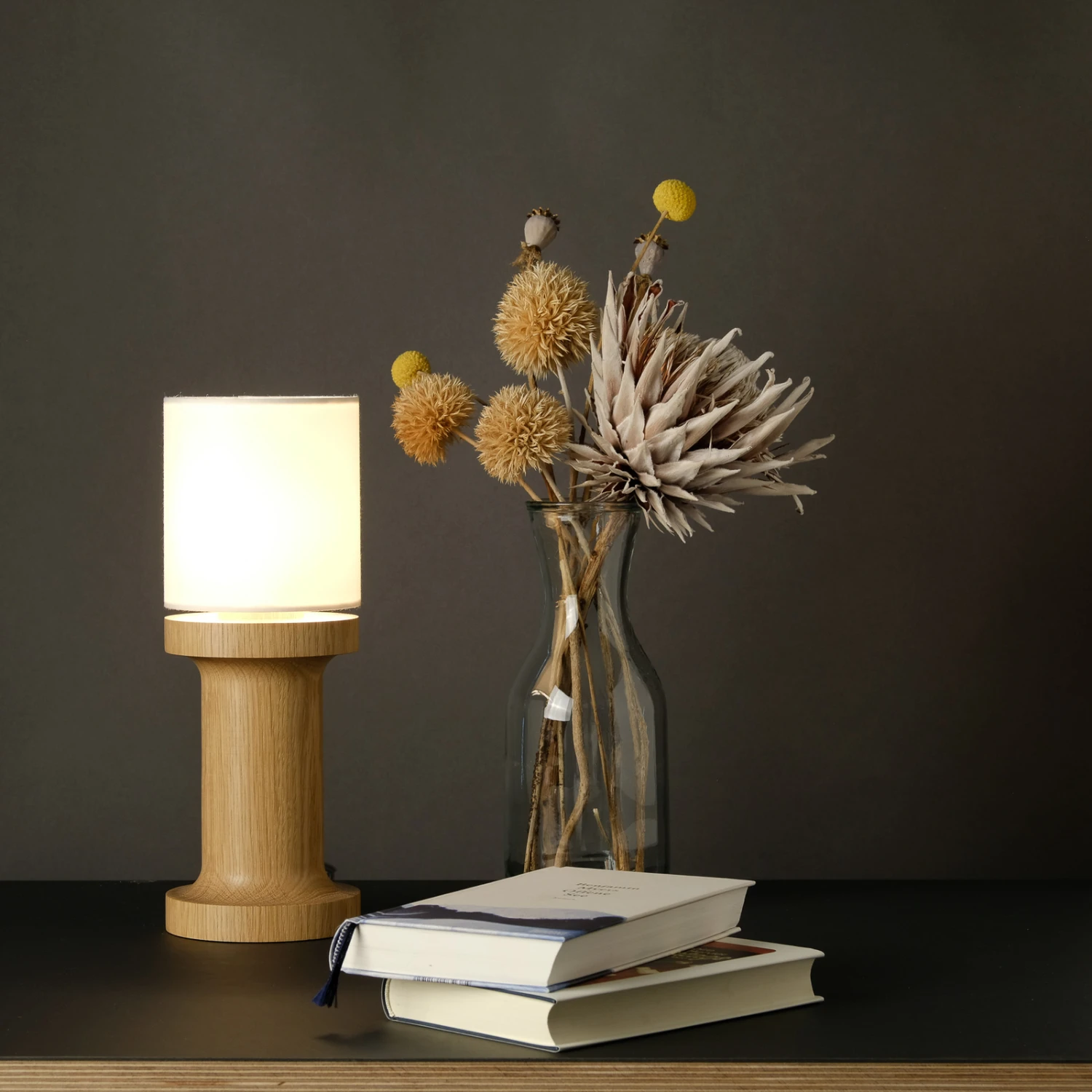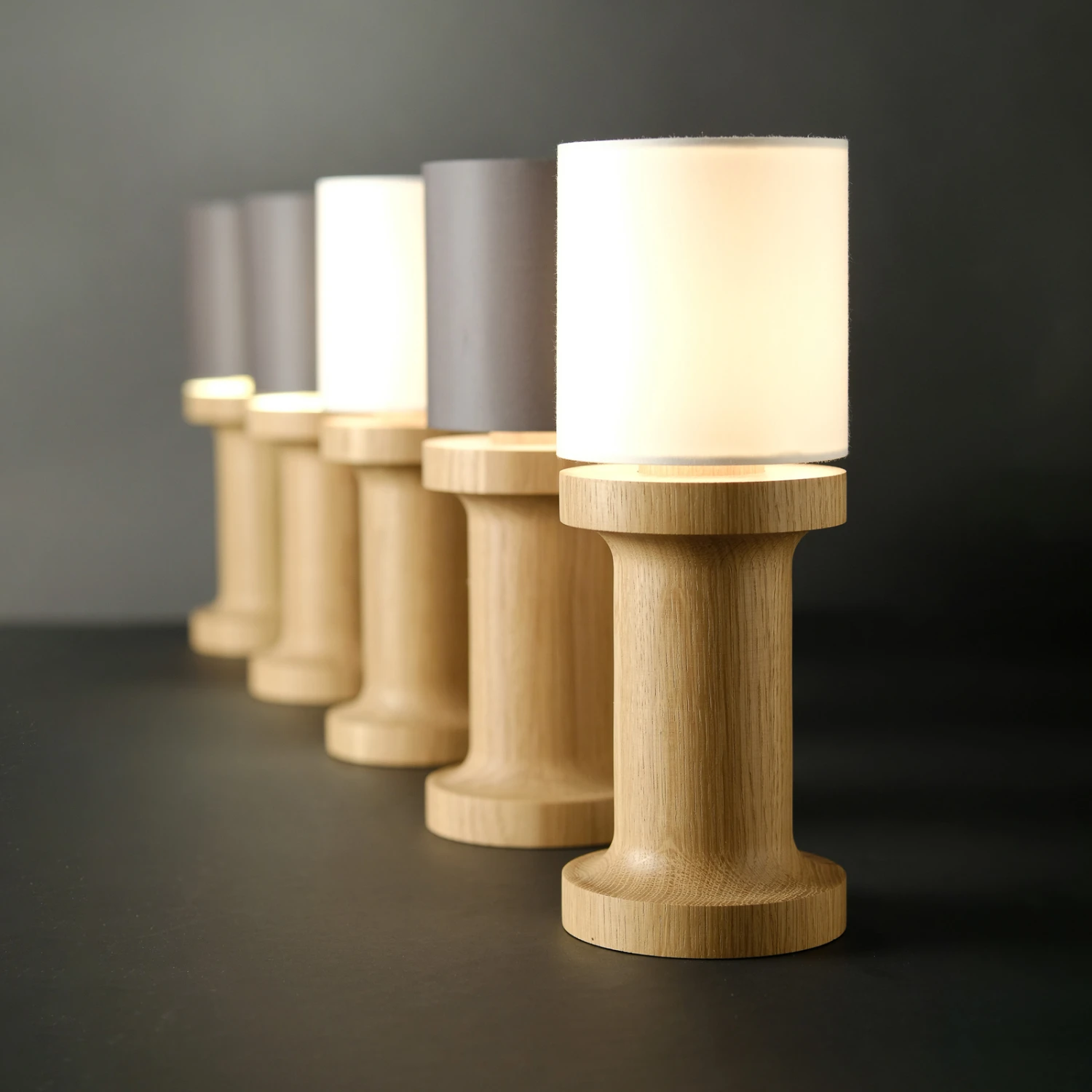 Kleine, kompakte Tischleuchte Tintin petit mit Fuß aus Eiche