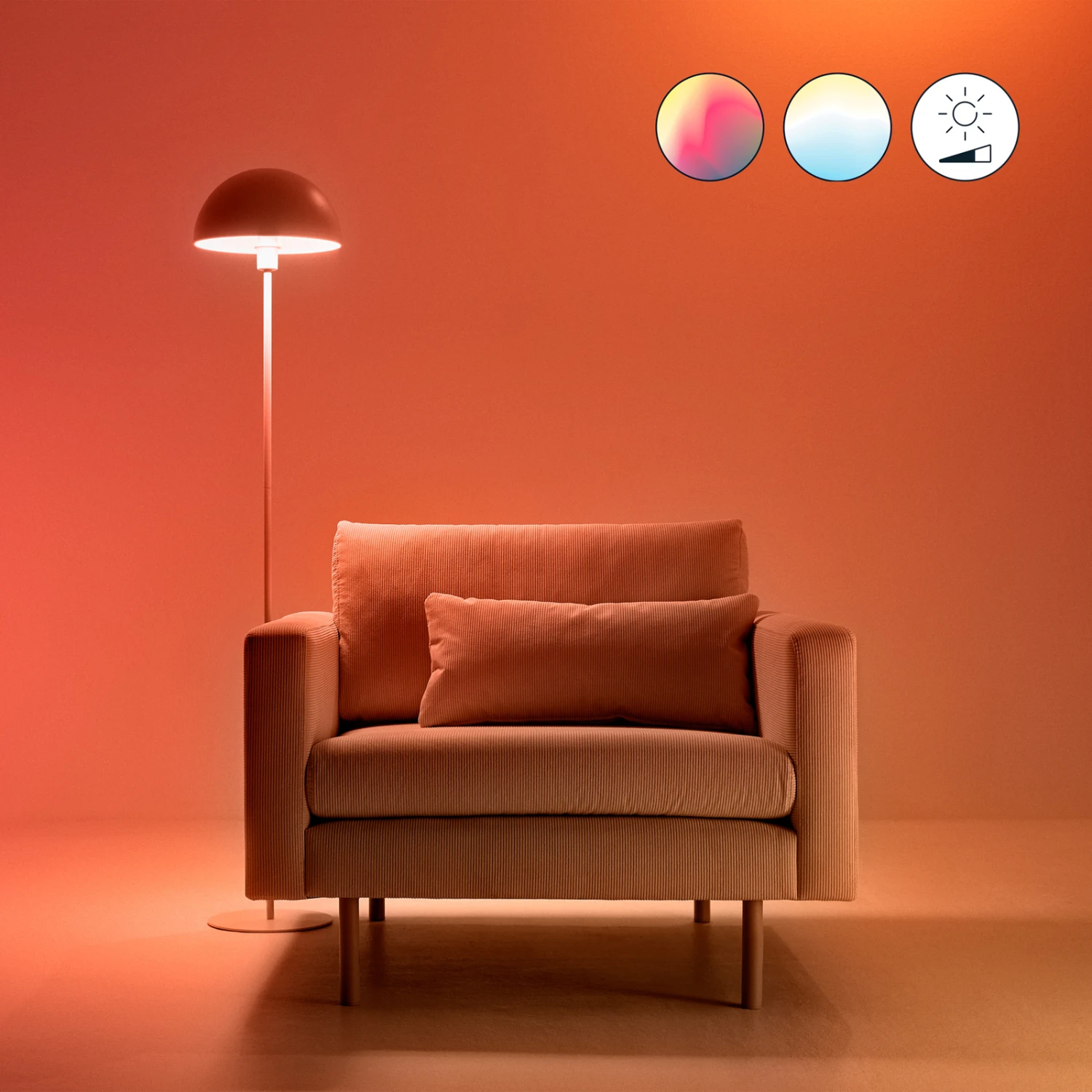Dieses LED-Leuchtmittel mit E27-Sockel vereint die klassische Form einer matten Glühbirne mit moderner Steuerbarkeit. Die Lampe kann sowohl wie gewohnt über den Lichtschalter aktiviert und deaktiviert als auch ganz modern per App, Sprachbefehl oder Fernbedienung auf die gewünschte Helligkeit oder Lichtfarbe justiert werden – perfekt zur smarten Einbindung lieb gewonnener Leuchten im Wohnbereich.