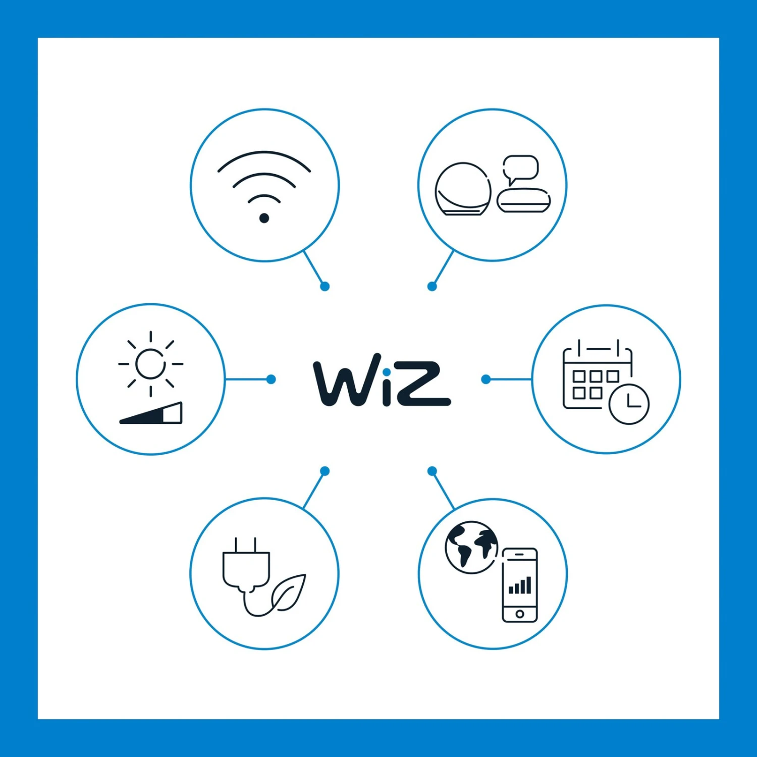 – versch. App-Funktionen: direktes Schalten und Dimmen; Speichern beliebter Szenen; Zuweisung der Leuchtmittel zu Räumen/Gruppen; Erstellung von Zeitplänen; Auswahl voreingestellter Lichtmodi/Szenen; Zuweisung mehrerer Nutzer und Vergabe von Zugriffsrechten; Bedienung von bis zu 10.000 WiZ-Leuchtmitteln